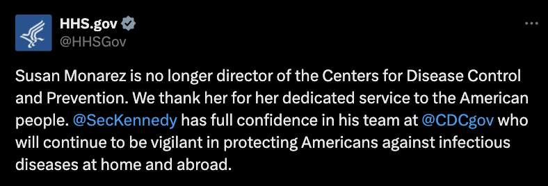 As much as you should feel appalled by the actions of RFK Jr. you should feel deeply proud of the courage of the public employees who stuck with their principles, even at the cost of their careers. If RFK Jr. Stays, the Attack on Public Health Will EscalateThe head of CDC has typically been a physician with deep public health experience. Monarez was not Trump’s first pick. This was Dave Weldon, a former Republican Congressman and Army doctor. Weldon did not have the type of public health experience normal of CDC directors, but RFK Jr. pushed the nomination. Why? Weldon shares the same doubts about vaccines that RFK Jr. does, embracing the widely-debunked idea that vaccines cause autism. As Weldon’s record became clear it also became clear that the Senate would not confirm him, and so Trump turned to Monarez. In effect, RFK Jr. wanted Monarez to adopt the views of the CDC nominee that even Senate Republicans could not support. The new acting head of CDC faces an incredibly tough job. Agency leadership has been decimated, morale is low, and employees no longer believe that the administration respects their mission of protecting public health. So who did RFK Jr. turn to? Well, it’s not good. Jim O’ Neill is not a physician, scientist, or someone with the public credentials normally associated with CDC director. He is currently the Deputy Director of HHS. He did work in the domain of public health during the Bush administration, but is more recently an employee of Peter Thiel, the Trump-supporting tech billionaire libertarian. Those libertarian views extend to public health. For example, O’ Neill has said: