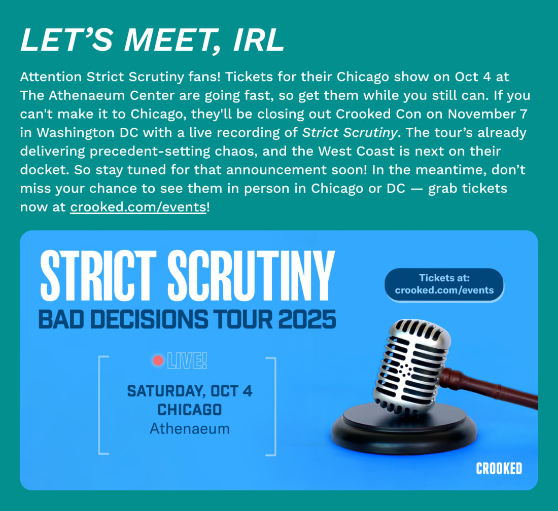 Will Patel be shipped off to some other Nordic country? Norway, perhaps? Is that what he was trying to tell us with that crack about “Valhalla”? WHAT ELSE?Trump announced the U.S. killed three people in a strike on a second Venezuelan boat he said was carrying drugs in international waters in the Caribbean. Legal experts have argued Trump has no legal authority to order such lethal strikes on what the law treats as criminal suspects. Top Trump Administration officials warned that they’re preparing to use Charlie Kirk’s murder as a pretext to crack down on left-leaning NGO’s and non-profits, a classic authoritarian tactic from places like Russia and Hungary. Vice President JD Vance hosted Kirk’s podcast from the White House today, and used the moment to call groups like the Ford Foundation “terrorist sympathizers.” Trump advisor Stephen Miller promised an “organized campaign’ to “dismantle these terrorist networks,” otherwise known as MAGA’s political opposition. Donald Trump and his Middle East envoy, Steve Witkoff, made millions off of a $2 billion Emirati investment in their crypto exchange company that was inked alongside an agreement to supply the United Arab Emirates with American A.I. chips, according to a New York Times investigation. Nothing like impeachment-level news way below the fold! The United States apologized to South Korea over the mass arrest and detention of hundreds of Korean workers at a battery plant construction site in Georgia. The raid enraged Koreans and threatened ties between the two countries. Donald Trump, who did not apologize, said the workers will be “welcome” when they reenter the U.S. So first they’re arrested and kicked out of the country, then they’re welcome? Got it. Federal prosecutor Maurene Comey sued the Trump Administration for firing her this summer. Comey, who handled cases involving Jeffrey Epstein, Ghislaine Maxwell, and Sean “Diddy” Combs, says she was fired because of Trump’s hatred for her father, former FBI director James Comey. But, no, we’re sure the Trump administration had some very normal, extremely boring, perfectly reasonable explanation. Y’know, like they always do. Light at the End of the Email…New Mexico is slated to become the first state to offer universal child care, under a plan put in motion by Democratic Gov. Michelle Lujan Grisham. Japan extended its decades-old record for the most people over 100. Stay golden, Japan! Atlanta’s National Center for Civil and Human Rights museum is expanding, even while Donald Trump cracks down on the Smithsonian to fit his personal take on American race relations. Wanna see the Muppets’ Swedish Chef perform The Sugarhill Gang’s 1979 classic, “Rapper’s Delight”? Sure you do. And you deserve it. Sound up! You’re currently a free subscriber to Crooked Media. For the full experience, upgrade your subscription. |