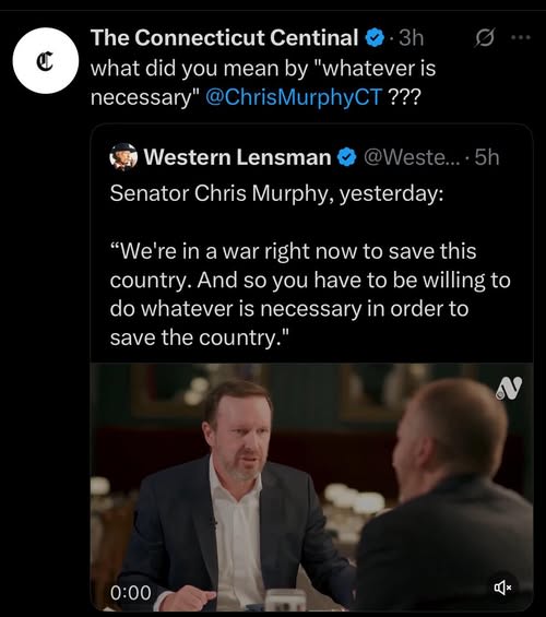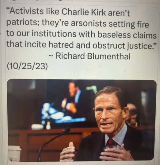 In the past several weeks, a violent criminal who had been arrested fourteen times slashed the throat and killed a 23-year-old woman. Then, a deranged leftist, 22-year-old murdered conservative activist, Charlie Kirk, while he was speaking at a college campus in Utah. The Late Charlie Kirk with his Wife and Two Daughters These atrocities are the culmination of liberalism gone amok, liberal judges allowing violent criminals to be released without bail and a Democratic base who will not accept an election result and prefers to call President Trump and his supporters Nazis, fascists and Hitler lovers. And Connecticut Democrats are leaders in this movement. Connecticut Representative Liz Linehan in her post in front of Trump Tower Senator Blumenthal stated, “Activists like Charlie Kirk aren’t patriots; they’re arsonists setting fire to our institutions with baseless claims that incite violence and obstruct justice.” Senator Blumenthal’s Opinion of Charlie Kirk. Senator Murphy has made a national reputation of himself with viral videos accusing President Trump of inciting violence so that he can declare martial law. The day before Charlie Kirk was murdered, he stated: “We are in a war right now to save this country. And we have to be willing to do whatever is necessary to save the country.” Hartford-area Congressman Larson recently attacked ICE, who is enforcing our anti-immigration laws, as Nazis and Gestapo agents. Click Here to Watch Congressman Larson’s Comments And this is a national trend among the Democrats. Former Vice-Presidential Candidate Tim Walz recently joked about hoping for news about President Trump’s death.