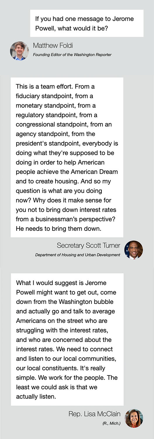 If you have a tip you would like to anonymously submit, please use our tip form — your anonymity is guaranteed! INTERVIEW: Why HUD Secretary Scott Turner and Rep. Lisa McClain want Jerome Powell to cut interest ratesby Matthew Foldi Secretary of Housing and Urban Development (HUD) and Rep. Lisa McClain (R., Mich.) had a joint message for Jerome Powell ahead of this week’s Federal Reserve meeting: cut interest rates. The two policymakers partnered for HUD’s Innovative Housing Showcase, which they held on the National Mall, and both spoke with the Washington Reporter about why Powell needs to learn from their leadership and hear directly from the American people; both, in fact, invited him to tour the country with them. “He needs to bring [interest rates] down,” Turner said. “This is not an individual thing. This is a team effort. From a fiduciary standpoint, from a monetary standpoint, from a regulatory standpoint, from a congressional standpoint, from an agency standpoint, from the president's standpoint, everybody is doing what they're supposed to be doing in order to help American people achieve the American Dream and to create housing. And so my question [to Powell] is what are you doing now? Why does it make sense for you not to bring down interest rates from a businessman’s perspective?” McClain agreed with both Turner and with President Donald Trump, who has been pressuring Powell to lower interest rates for months. “At the end of the day, I'm out there in the communities, and I hear from people who are thinking about buying or who want to buy, and the rates are a big deal for that,” McClain said. “It just matters. What I always tell people is that Washington bubble is real. What I would suggest is Jerome Powell might want to get out, come down from the Washington bubble and actually go and talk to average Americans on the street who are struggling with the interest rates, and who are concerned about the interest rates…We work for the people. The least we could ask is that we actually listen.” Both McClain and Turner also laid out three-point agendas that each are working on to lower costs for Americans like their children to buy a home, which both said is a critical part of the American Dream. Heard on the Hill