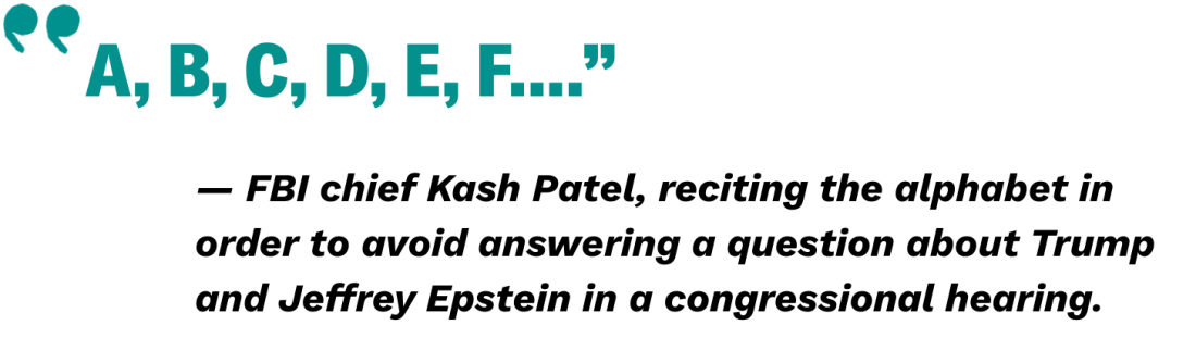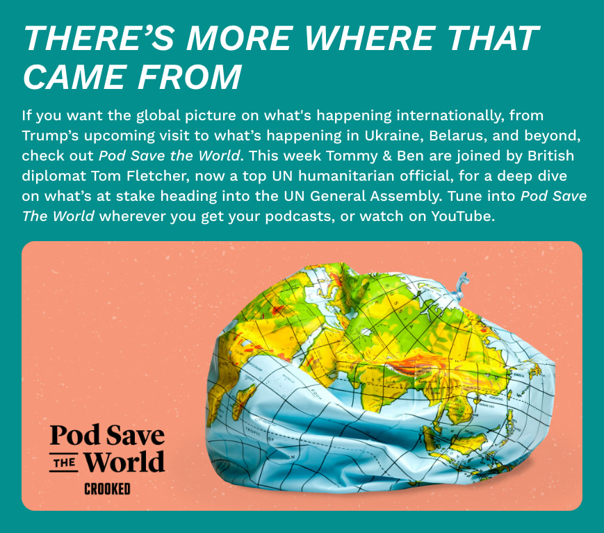 “I believe preventable diseases will return — and I believe that we will have children harmed by things that we know they do not need to be harmed by,” Monarez warned. “The stakes are not theoretical.” WHAT ELSE?The EU proposed new sanctions on Israel as its forces continued their assault on Gaza City. The measure would increase tariffs on Israeli goods, and sanction some right-wing settlers along with two senior members of Israeli Prime Minister Benjamin Netanyahu’s government. The tough new measures may not be approved, however, due to lack of consensus among EU member countries. Four people were arrested for projecting an image of Donald Trump and his longtime friend, the deceased sex offender Jeffrey Epstein, on the exterior of Windsor Castle ahead of Trump’s state visit. Jerry Greenfield of Ben & Jerry’s — yes, that Jerry — quit his namesake company after 47 years, saying his independence to speak out on social justice issues has been stifled by parent company Unilever. “It was always about more than just ice cream,” Jerry wrote in an emotional farewell letter. Shoutout to a real one, Jerry. (This newsletter once asked you amazing readers to pitch ideas for an imaginary ice cream flavor, and you sent in Peachful Protest, Fudge the System, and Constitutional Crunch.) FBI Director Kash Patel had another day of bonkers testimony on Capitol Hill. This time he falsely claimed that federal court orders prevent him from releasing Epstein files, and refused to say whether he discussed Donald Trump’s appearances in the files with Attorney General Pam Bondi. He also caused Krispy Kreme shares — which he owns — to spike, after calling them a “good investment.” Do they serve Krispy Kreme donuts at the Norse warriors’ dining hall in Valhalla, Kash? Even if TikTok gets American owners, it will still keep its old Chinese algorithm, under the tentative deal arranged by Trump, Chinese officials said this week. U.S. officials have called that algorithm a security threat, given the app’s widespread use and ability to sway public thinking… So the point of forcing its Chinese owners to sell a majority stake is, at best, in question. Great work, Donald! Master dealmaker at work! A senior Trump official used the same mortgage practices that the Trump administration has used to target political opponents, according to Bloomberg News. Treasury Secretary Scott Bessent reportedly listed two homes as primary residences. Bessent’s lawyer told Bloomberg the paperwork was all done properly. Still, could this embarrassing moment, just maybe, explain why Bessent reportedly threatened to punch Trump’s top mortgage official, the guy widely known for digging into these records, in his “fucking face”? The Federal Reserve moved to cut the benchmark interest rate by a quarter point, an expected response to weakening jobs numbers and tariff-fueled upticks in inflation. Trump has been pressuring Fed Chairman Jerome Powell to cut rates. Powell also signaled the central bank is likely to do more rate cuts in the near future. Light at the End of the Email…The new @whitehouse TikTok account has largely turned into an anti-Trump message board as haters bombard the comments with reactions like “most corrupt president ever.” Awkward: Fox founder Rupert Murdoch was slated to attend the UK state dinner honoring Donald Trump Wednesday. Weird to discuss Trump’s $20 billion lawsuit against Murdoch and the Wall Street Journal over its reporting on Jeffrey Epstein’s birthday book, all over poached salmon! A Virginia woman who won a $150,000 lottery prize earlier this month donated the entire jackpot to charity. Carrie Edwards, of Winchester, said she wanted to “bless others” with the gifts, which included $50,000 each to a dementia charity, a food equity organization, and a relief organization for military families and veterans. You’re an inspiration, Carrie. You’re currently a free subscriber to Crooked Media. For the full experience, upgrade your subscription. |