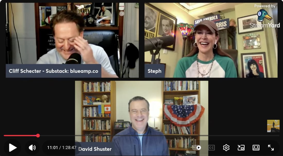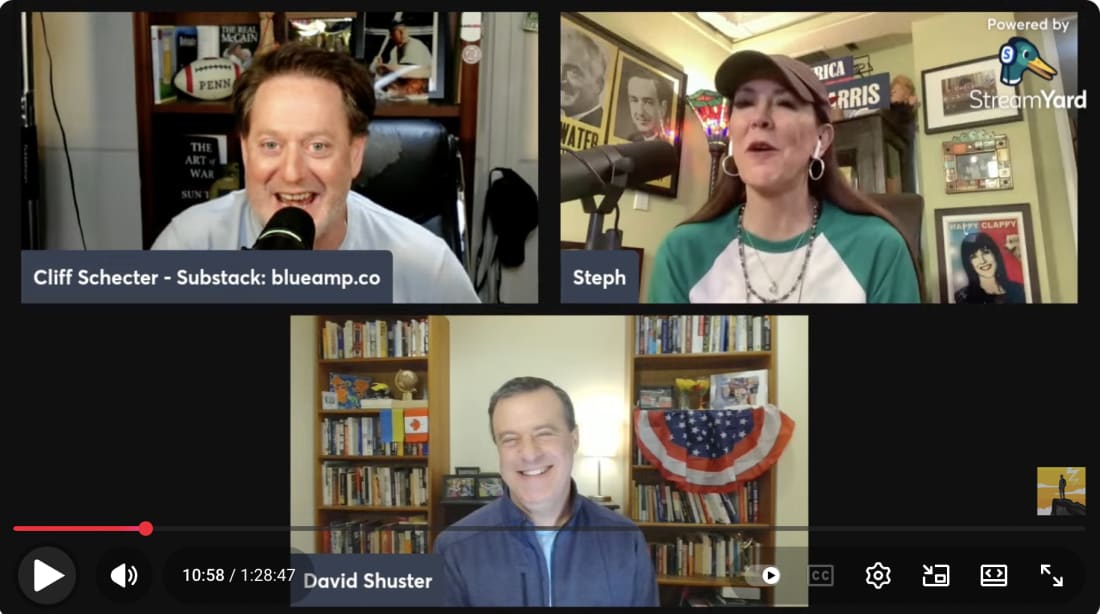 Stephanie, Charlie, and the Culture of Bulls*tThe Comedy of Errors Before the Comedy of PoliticsIf you know Cliff Schecter, then you know it wouldn’t be a Cliff Schecter show without some live-streaming hell breaking loose. It almost feels like a brand. Before Stephanie Miller even joined the show, Cliff was challenging his tech setup to a duel, promising to worship any deity that could get the camera working, and railing against “the communists” for sabotaging the stream. You know, those guys taking over Intel. As one does…if their name is Yuri Andropov. Seven minutes of not-Heaven later, Stephanie appeared, David Schuster popped in, and suddenly we had an Emmy winner, a liberal radio legend, and Cliff making self deprecating jokes. He compared himself to everyone from a Kardashian—whom we hear is a family who do some shows on tv—to a Carpathian. Whom we hear…does not. Vigo, everyone’s favorite painted Carpathian from Ghostbusters II, who comes from the same region as the late Ivanka Trump. We think there may be a familial connection there. Titanic Jokes, MAGA Lawlessness, and the Infamous Bag of D*ksWhat, did you expect a show with Cliff, Stephanie and David to be profanity-free!? Moving on, the banter flew fast: Stephanie compared herself to the Titanic’s old lady which she correctly pointed out had some serious small “MAGA energy.” What with Rose not letting Jack on the the big piece of wood. Cliff surmised it was “probably because Jack was vaccinated.” Then Stephanie told a story about MAGA-hatters parking in disabled spots and red zones during her bike ride to a rest stop near Pepperdine College, ignoring cops. Classic Trumpism: laws are for the rest of us. Stephanie called MAGA a bag of d*ks. Cliff pointed out it was “unwashed d*ks” and David made clear it was a “limp bag of d*ks.” Which of the three was it? The answer you’re looking for here is “yes.” Kash Patel’s Ass-Kicking and the Epstein File CircusThe crew dug into Kash Patel’s disastrous performance on Capitol Hill with Democrats including Dan Goldman and Jamie Raskin humiliating him. They exposed his Patel tried a Biden-is-old joke about “autopen” while defending child rape coverups. All three agreed that his eyes may have even disagreed with each other as to how wise it was to try that one. Cliff framed it perfectly: Kash is a “Petri dish for stupid,” a cosplay FBI director in a leather jacket who looks like “Buffalo Bill porn.” Did ICE make him wear this in lieu of life in a San Salvador prison? And returning to our hearing, Raskin caught Patel in his own trap: If you say the FBI has Epstein files, and you’re the FBI Director, why don’t you release them? Patel had no answer. Or, alternatively, he was the first person in recorded history to suddenly go mute due to no known medical condition. Violence, Guns, and the Right’s Projection GameThe conversation then turned more serious. Stephanie and David pointed out how Pam Bondi and Trumpworld are trying to weaponize “hate speech” against the left, while ignoring Laura Loomer and Nick Fuentes—both of whom spewed vitriol about Charlie Kirk just days before he stopped being alive. Therefore, per Bondi’s proclamation, they are responsible and should be arrested. They went on to discuss The Right’s endless violent rhetoric, in general. This has led to recent tragic attacks on Minnesota Democratic lawmakers and the CDC. Not to mention Jan 6th, bombs in abortion clinics, an Oklahoma City building, an Olympic festival in Atlanta, a Paul Pelosi hammer attack and the list goes on. We’re not even counting their ghoulish behavior abroad (see Venezuela). Stephanie reminded everyone that the DOJ just deleted its own report showing the vast majority of extremist violence comes from the far right. Cliff had the report’s stats ready—as he’d intended to include them in a rant he’d planned for the beginning of the show if he hadn’t screwed up all manner of technology in his office. Your stats: since 1990, far-right extremists have committed 227 attacks killing 520+ people—a rate 550% higher than that of the left. The trio ripped apart the narrative around Charlie Kirk’s assassination. Stephanie: “nobody on the left celebrated it”—it shook everyone in public life. David: “the shooter came from a repressive MAGA household, obsessed with guns, raised in a culture of right-wing hate.” Cliff: our gun culture tells young white men guns are part of their identity. Then Republicans make guns easier to get than cold medicine (example: His grandfather gave him the gun as a gift; no background check, no psych evaluation, no required time on the range. This couldn’t happen in any other advanced democracy). The through line? Guns + violence-inciting disinformation + MAGA repression/mental health challenges = inevitable violence. The Media: From Watchdogs to Scarborough DailyAll three slammed corporate media. Karen Attiah was fired from The Washington Post for simply quoting Charlie Kirk. Matthew Dowd was canned from MSNBC for answering a question their anchor asked him, and doing it gently. Rumors are swirling that Barry Weiss may take over CBS editorial. Cliff called MSNBC “the Scarborough Daily” and corporate media a whitewashing machine. David, a former Emmy winning anchor at both MSNBC and CNN, added: people now trust YouTube more than mainstream outlets—and they’re right to. Trump Plays Golf While Kirk’s DeadCliff dropped the kicker: while the right demanded “reverence” for Charlie Kirk, Trump skipped the Kennedy Center vigil for him to play golf. When asked if he was still grieving about him a day or so later, he answered by bragging about his new gilded ballroom being built. The man who tells us he’s the only one who cares about America can’t even fake mourning for his supposed protégé for longer than 24 hours. Why This MattersThe conversation wasn’t just jokes (though there were