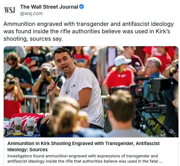Despite that fact check, The Wall Street Journal was slow to update its story. At first, it simply added, ‘some sources urge caution’ to the headline, which read on Friday: Early Bulletin Said Ammunition in Kirk Shooting Engraved With Transgender, Antifascist Ideology; Some Sources Urge Caution. That’s a very odd headline. What sources? The original story quoted ATF sources. Were these new sources also at the ATF? The meaning is unclear, and the original version still stands as the one the Journal backs, though now with some indication that maybe not everyone agrees. Then came a second update and Journal editor’s note that reads, in part: “Justice Department officials later urged caution about the bulletin by the Bureau of Alcohol, Tobacco, Firearms and Explosives, saying it may not accurately reflect the messages on the ammunition.” Still, even after this “caution” the Journal did not retract its story – a story based entirely on a now discredited ATF bulletin and where no evidence existed to support its incendiary conclusion. The Journal’s viral X post with the original breaking news story has been deleted. Over at Bluesky, the original incorrect post is still up with an added editor’s note that has been seen by far fewer people than the original post. Uproar over WSJ’s debunked pieceMany critics have called out the sloppy reporting and inadequate response, including transgender writer Charlotte Clymer who notes: