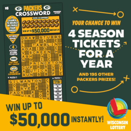 The Packers Crossword scratch game has instant top prizes of $50,000. PLUS, all non-winning tickets can be used to enter a BONUS DRAWING to win 4 SEASON TICKETS for a year.