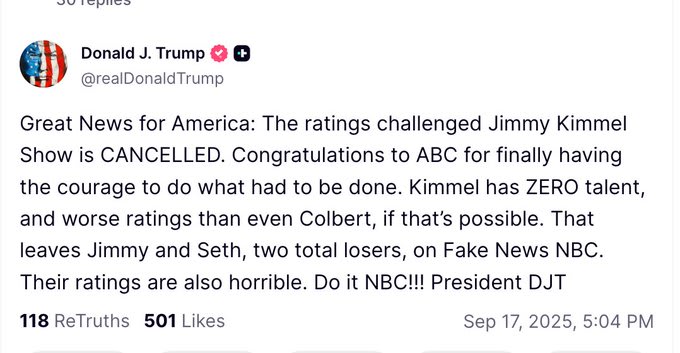 Trump Celebrates Network Move: President Donald Trump gloated on Truth Social, mocking Kimmel's "zero talent" and dismal ratings compared to rival Stephen Colbert, amplifying the political firestorm.
