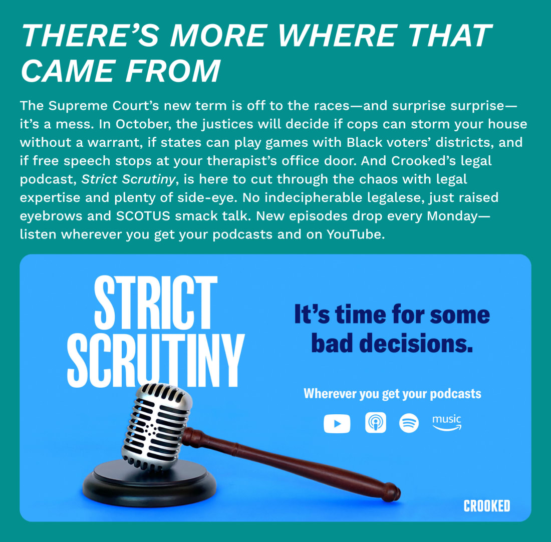 Kimmel’s return underscores that Trump’s power to intimidate his foes does have limits, especially when he’s so unpopular. THE HARISSA-MENT OF TOM HOMANDon’t you just hate it when your $50,000 wad of cash gets all sticky with hummus and tahini, because the federal agents investigating you for potential corruption stuffed it into the bottom of a paper bag from the fast-casual dining chain CAVA? Actually, it’s far from clear whether the bag full of bills in question, which was reportedly accepted by Tom Homan last year before he went on to become Trump’s Border Czar, also had any food in it. But according to MSNBC and the New York Times, the interaction was recorded as part of an undercover probe into whether Homan was soliciting payments in exchange for awarding contracts should Trump win the election. Trump appointees then closed the probe, soon after Trump entered office, according to MSNBC. The White House said Homan didn’t take the money and “did absolutely nothing wrong,” and accused former President Joe Biden’s FBI of “going undercover to try and entrap” the future official. Homan himself dismissed the probe: “Nothing to it.” This news popped over a weekend when Trump appeared to be placing unprecedented pressure on the Department of Justice, complaining publicly to “Pam,” aka, his Attorney General Pam Bondi, that his enemies haven’t yet been prosecuted. That includes NY Attorney General Letitia James, Sen. Adam Schiff (D-CA) and former FBI Director James Comey. Well. As long as we’re in Trump and Bondi’s DM’s… Sir, can you scroll up to the ones about the Epstein files? WHAT ELSE?The Trump Administration endorsed what experts call an unproven link between autism and the painkiller acetaminophen, the active ingredient in Tylenol — drawing conclusions that medical experts warn are rushed and over-simplistic. In a White House press conference filled with medical disinformation, Trump stumbled to pronounce the word “acetaminophen.” Reminder, folks: Trump is the guy who suggested injecting bleach to treat COVID… so, y’know. Trump named a White House advisor and former personal lawyer as the new interim U.S. Attorney for the Eastern District of Virginia (EDVA). Lindsey Halligan is a former insurance lawyer with no experience as a prosecutor. The EDVA prosecutes many sensitive national security and terrorism cases. Halligan’s most recent White House job was cracking down on Smithsonian museums the administration considers “woke.” Only the best people! Donald Trump and his family have netted billions of dollars since he returned to the White House, largely from crypto investments, according to a Forbes analysis. Trump’s net worth has jumped $3 billion in one year, while his children have amassed billions collectively, largely through deals in foreign countries with official business before Trump’s administration. Even Trump’s youngest son, the 19-year-old college sophomore, Barron, is now worth an estimated $150 million or more thanks to crypto transactions. Wow, sure beats running a lemonade stand, huh? Investigators haven’t yet found evidence linking Charlie Kirk’s alleged murderer to any left-wing groups, NBC News reported, citing multiple sources. The suspect appears to be “one guy who did one really bad thing because he found Kirk’s ideology personally offensive,” an investigator told the outlet. Trump and his supporters have continued to blame Kirk’s murder on left wing political forces. The Supreme Court cleared the way for Trump to fire the last remaining Democratic appointee on the Federal Trade Commission. It’s all part of Trump’s push to overturn 90 years of precedent and grab control of independent executive agencies. Light at the End of the Email…Harry Styles is… an incredible runner? The flamboyant English singer completed the Berlin Marathon in a stunning sub-3 hour time, and he did it under the incognito name, “Sted Sarandos.” That’s one direction…to the finish line, Harry! Environmentalists and climate activists gathered in New York City for “Sun Day” in support of solar power and other renewable energy. Organizers held events in more than 500 locations around the country in support of clean energy. NASA introduced its new class of astronaut candidates. The group of 10 recruits will compete to join the astronaut corps expected to return to the moon as part of Project Artemis. Meet Dory, the eyeless Canadian cat who landed a starring role in the new Stephen King movie “The Long Walk”, Dory sat on a mailbox and performed ad-meowr-ably. Can dogs use their sense of smell to tell time? Experts say… probably! Wow. Is there anything our furry friends can’t smell? You’re currently a free subscriber to Crooked Media. For the full experience, upgrade your subscription. |