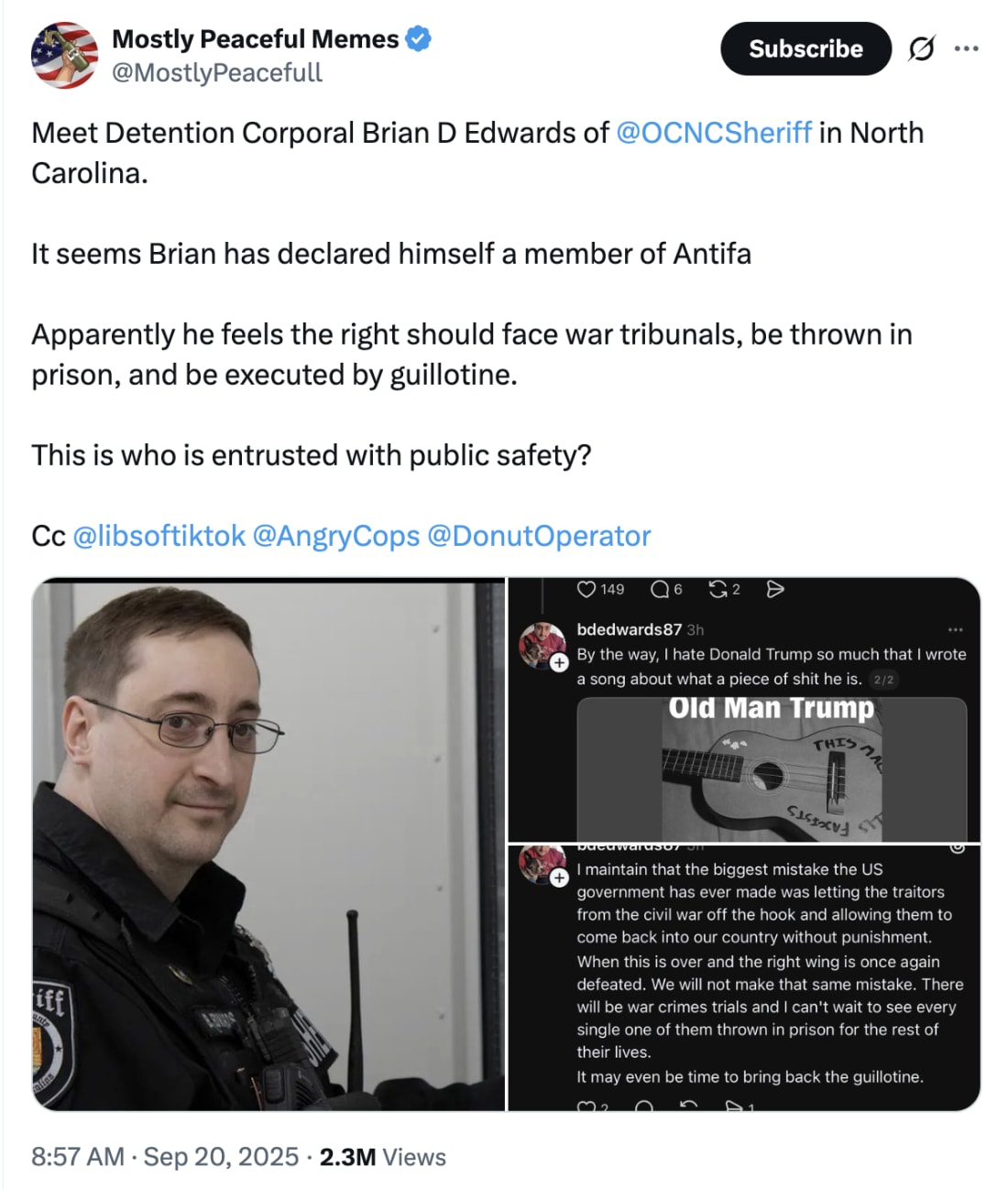 North Carolina officer fired after declaring himself “Antifa” and calling for violence against “traitors”Brian Edwards, 37, a corporal with the Orange County Sheriff's Office, was terminated after posting on BlueSky that he identified as "Antifa" and called for "war crimes trials" against right-wing "traitors," suggesting bringing back the guillotine for executions. “There will be war crimes trials and I can’t wait to see every one of them thrown into prison for the rest of their lives,” Edwards wrote. “It may even be time to bring back the guillotine.”