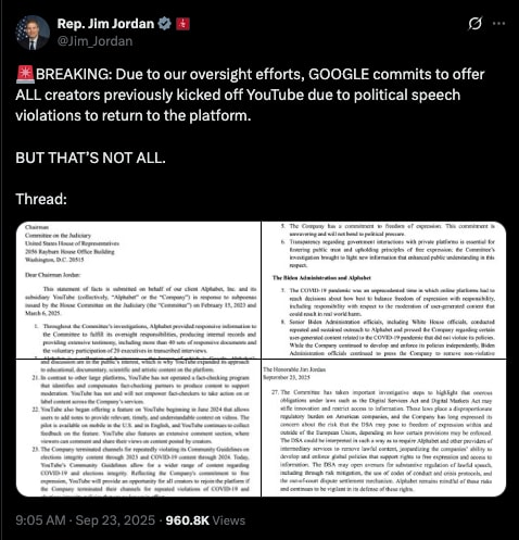 Google makes MAJOR U-turn, will reinstate accounts it banned over Covid and election contentGoogle announced Tuesday it will reinstate YouTube accounts banned for COVID-19 and election speech, admitting in a House Judiciary Committee document that Biden administration pressure led to unwarranted censorship of non-violative content.