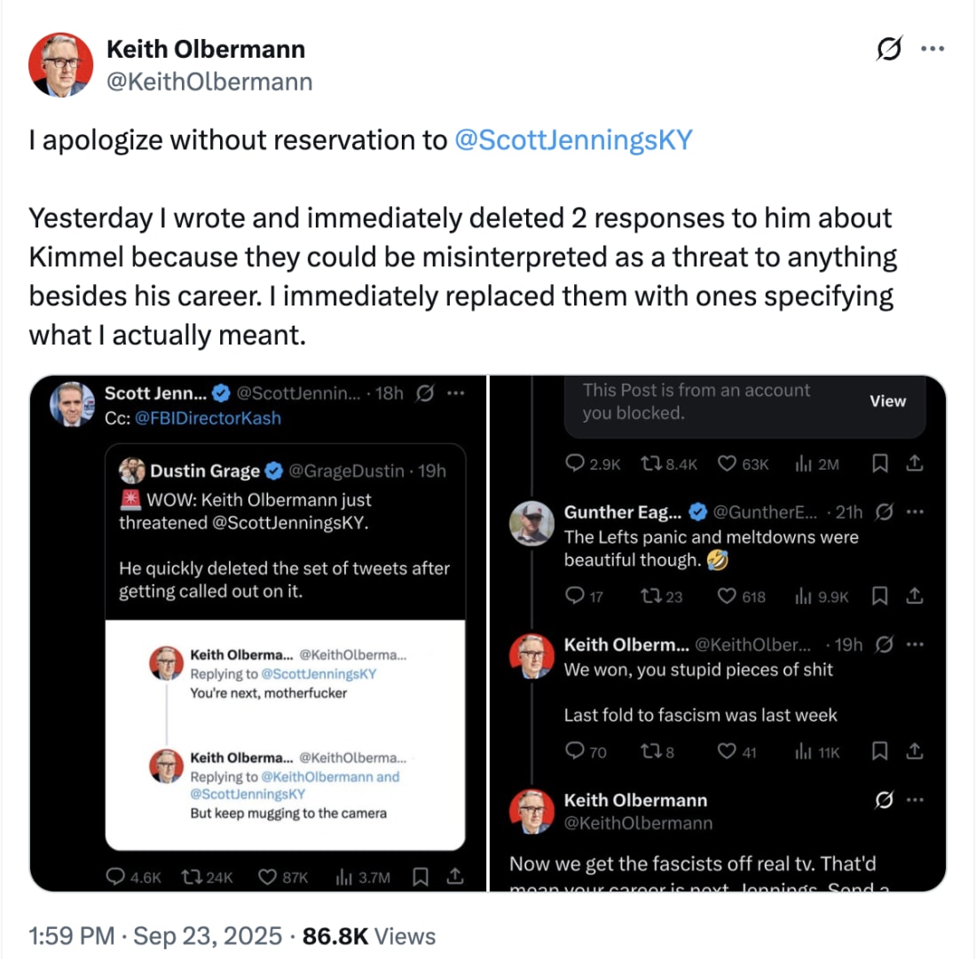 Keith Olbermann’s unhinged antics just got worse…Former MSNBC host Keith Olbermann posted a series of vulgar social media attacks targeting Secretary of State Marco Rubio (calling him a "political prostitute"), border czar Tom Homan (making crude jokes about his name), and Health Secretary RFK Jr. regarding his sexting scandal.