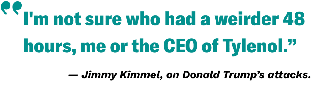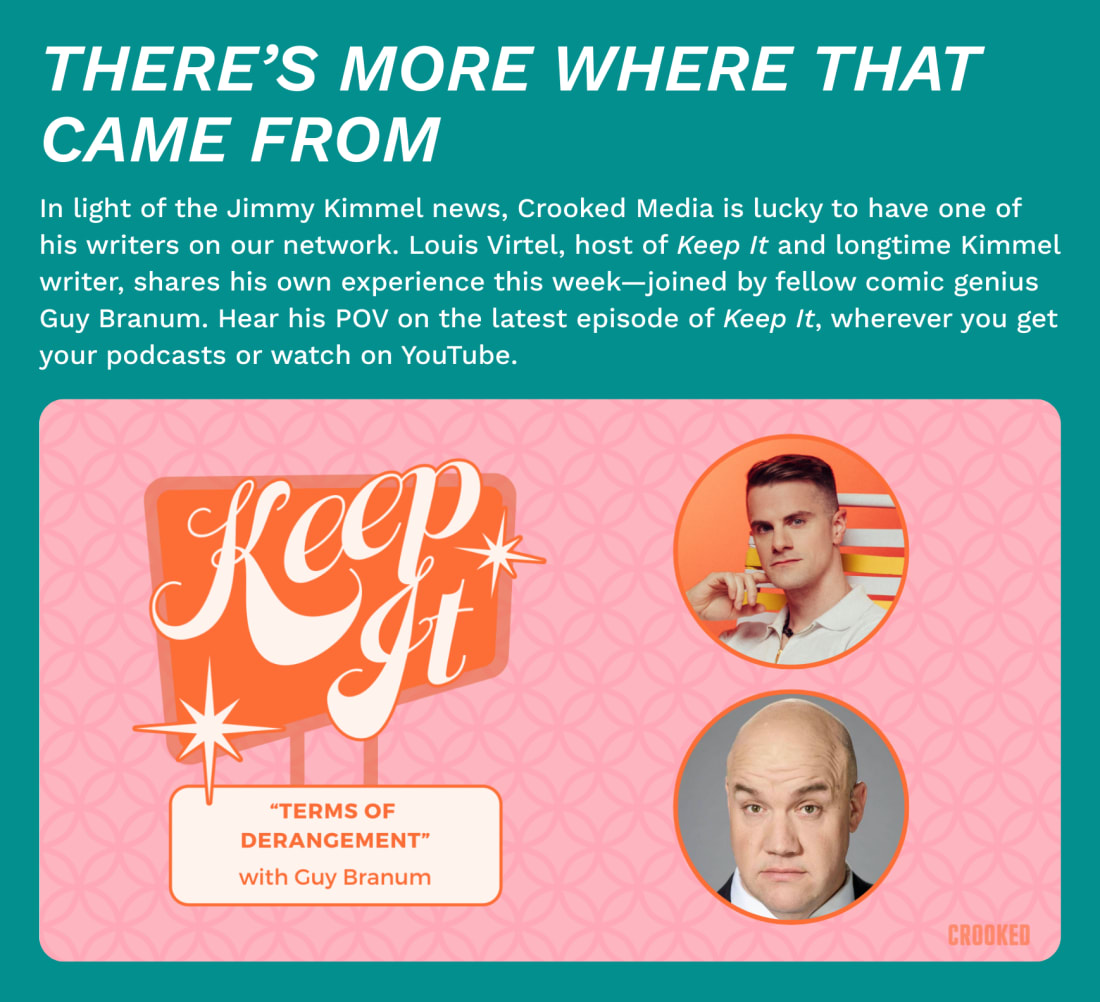 It’s hard to imagine a sillier problem than an escalator that turns into stairs. Well, maybe if Trump were also wearing a tan suit. ‘AS I WAS SAYING…’Viewers flocked to Jimmy Kimmel’s triumphant return to ABC on Tuesday night. As of this writing, the YouTube video of Kimmel’s Tuesday monologue had nearly 15 million views in under 16 hours. Way to silence your critics, President Trump! Kimmel alternated between jokes and earnest appeals to American ideals, including free speech. And he set aside special praise for usual right-wing haters who came to his defense, including pundit Ben Shapiro, Sen. Rand Paul (R-KY), and Sen. Ted Cruz (R-TX). “Think about it… If Ted Cruz can’t speak freely, then he can’t cast spells on the Smurfs,” Kimmel said, comparing Cruz to the cartoon’s bad guy Gargamel, before praising Cruz for his “courage.” Two MAGA-aligned media companies refused to carry Kimmel’s return, however. Sinclair and Nexstar boycotted the broadcast on their dozens of local ABC affiliates. And that was after FCC Chair Brendan Carr openly threatened Nexstar, on behalf of the U.S. government, in order to punish Kimmel in the first place. Way to stand up to the man, Nexstar! Right-wing media spent Kimmel’s off-time downplaying government coercion with the claim that ABC sidelining Kimmel was strictly business, not Trump-directed censorship. That excuse was destroyed, by, of course, Trump himself, who promptly threatened Kimmel again as soon as he learned the comic would be back on the air. “I think we’re gonna test ABC out. Last time I went after them they gave me $16m. This one sounds even more lucrative,” Trump wrote, suggesting he’d sue ABC again. In other words, this story may not yet be over…. WHAT ELSE?Trump’s Justice Department is preparing to indict former FBI Director James Comey, potentially on charges of lying to Congress over press leaks in 2020, according to reports in MSNBC and ABC News. A prosecutor handpicked by Donald Trump may bring the case even though prosecutors and investigators believe there is insufficient evidence, ABC reported. Comey may be indicted in Virginia, where Trump last week pushed out a widely respected career prosecutor for reportedly refusing to prosecute Trump’s enemies. One detainee died and two others were critically injured in what authorities described as a “sniper” shooting at an ICE detention facility in Dallas. No law enforcement personnel were hurt in the attack. FBI Director Kash Patel immediately began publicizing potential evidence, including a photo of unspent shell casings marked “ANTI-ICE.” The suspect died in the attack. Top DOJ “weaponization” henchman Ed Martin retracted a bizarre letter demanding information from an attorney representing a retired FBI agent who responded to the massacre at Sandy Hook Elementary School in 2012. The agent testified about his experience responding to the shooting at the defamation trial of right-wing conspiracy theorist Alex Jones. Martin was reportedly ordered to rescind the letter, which implied the agent could be under criminal investigation, after Jones posted it online. Maurice Hastings, 72, was awarded $25 million after spending 38 years in prison in California for alleged crimes he did not commit — in the state’s largest wrongful conviction settlement ever. Light at the End of the Email…Democrat Adelita Grijalva won a special election for a House seat once held by her late father in Tucson, Ariz. Grijalva’s win narrows Republicans’ already thin majority to 219-214. Grijalva may be the last signature needed to force a House vote on releasing the DOJ’s Epstein files… which Trump and GOP leadership have been trying to stop. Streamer Kai Cenat gifted a fully-furnished home and a car to a mother and son on the verge of eviction. What could make a bachelorette’s big night out better than this viral serenade from one of Salem, Massachusetts’ bravest? Wanna see a website dedicated to mapping every music genre on Earth, from Belgian techno to Corsican folk? Sure you do. It’s right over here at Every Noise At Once, founded by former Spotify employee Glenn McDonald. You’re currently a free subscriber to Crooked Media. For the full experience, upgrade your subscription. |