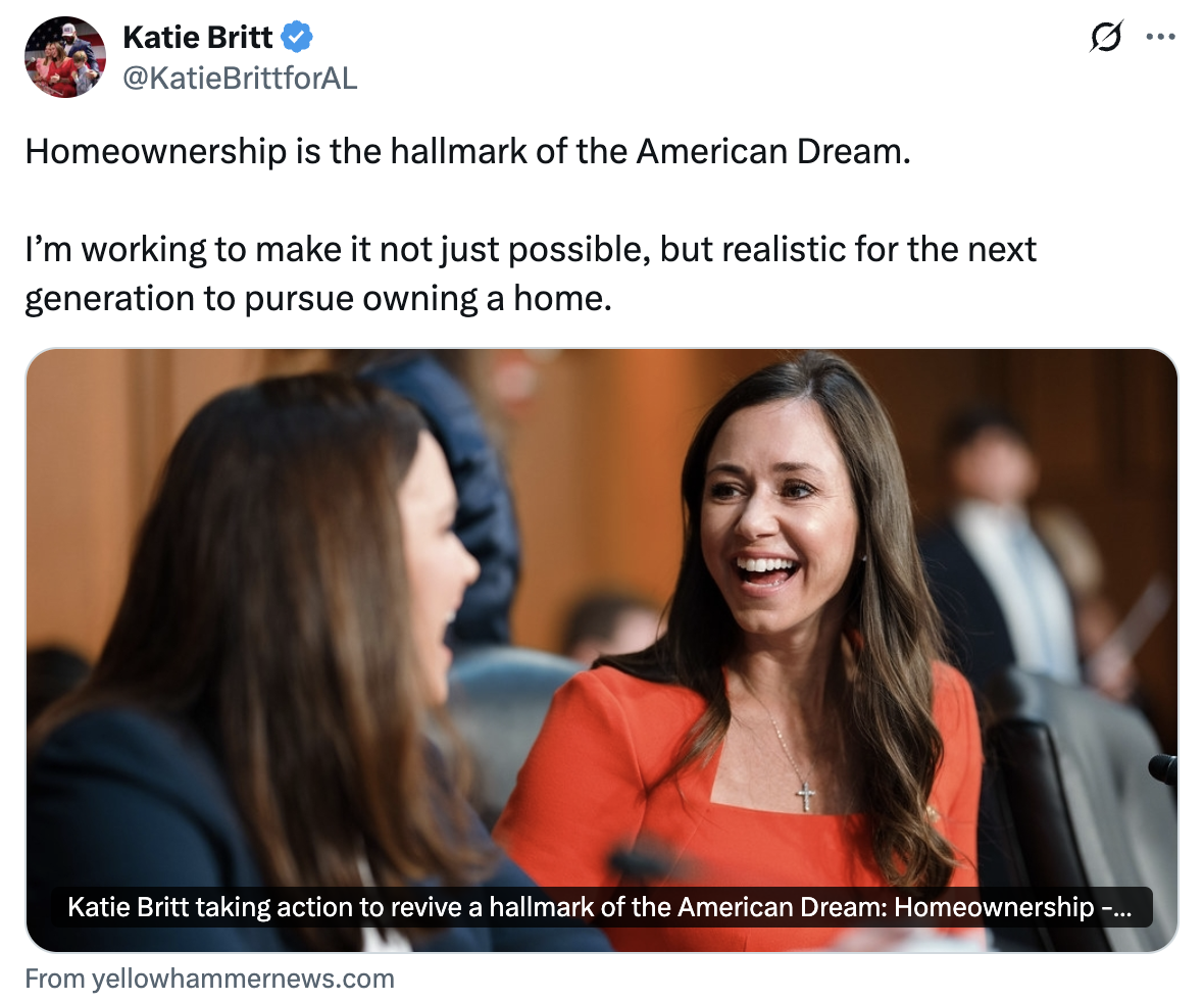 It is easy to spot the ingredients in her recipe for success. Very few people ever have the complete package – but Britt has quickly proven to be a history maker. | | | U.S. Senator Katie Britt (R-Montgomery) is working to revive one of the tenets of the American Dream, growing increasingly out of reach for many: Homeownership.