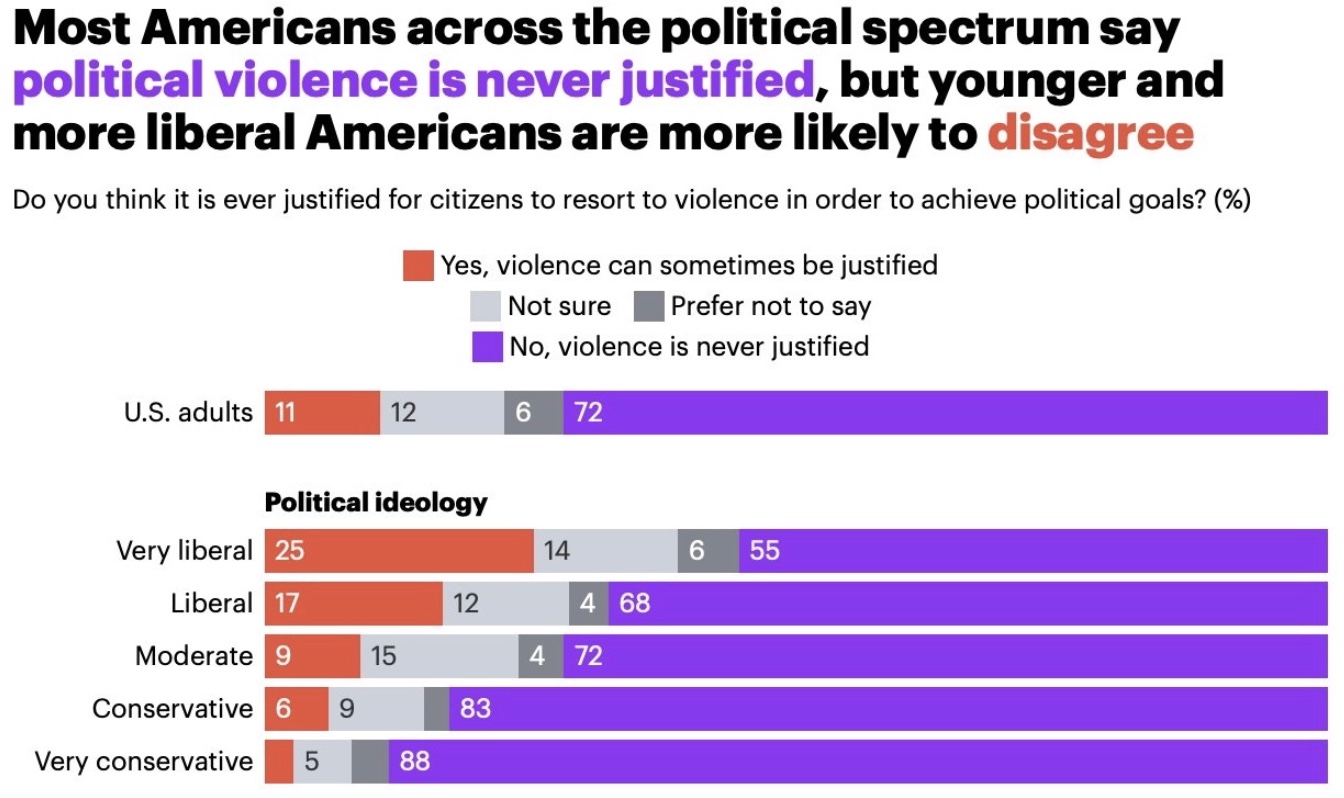 As if these events aren’t horrifying enough, a new poll has revealed something deeply disturbing: while most Americans reject political violence, a shocking number of liberals believe violence is a justified means to a political end. |