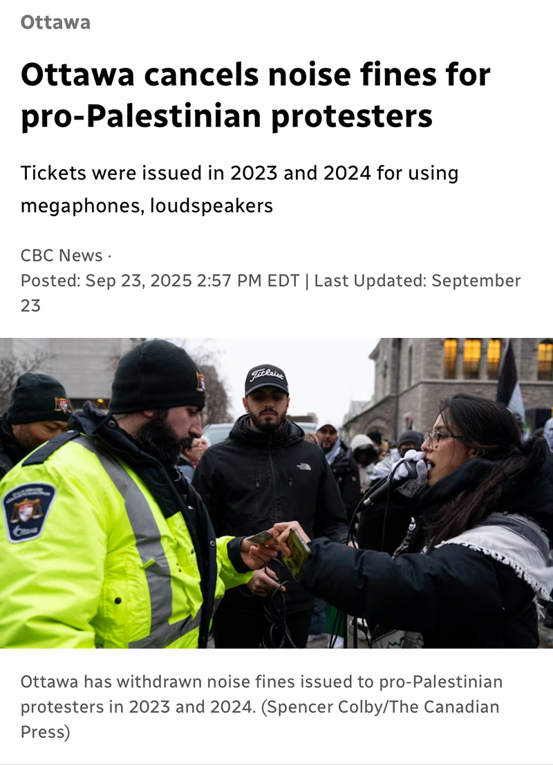 This week, we learned that the City of Ottawa has withdrawn fines issued to pro-Palestinian protesters in 2023 and 2024.