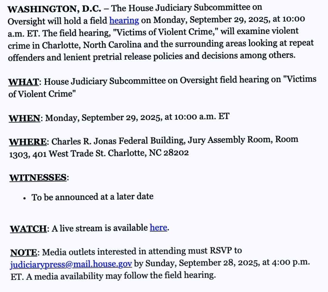 Congress Comes to Charlotte: Crime Policies Under FireSpecial field hearing follows brutal stabbing of Ukrainian refugee Iryna Zarutska amid rising repeat-offender violence.