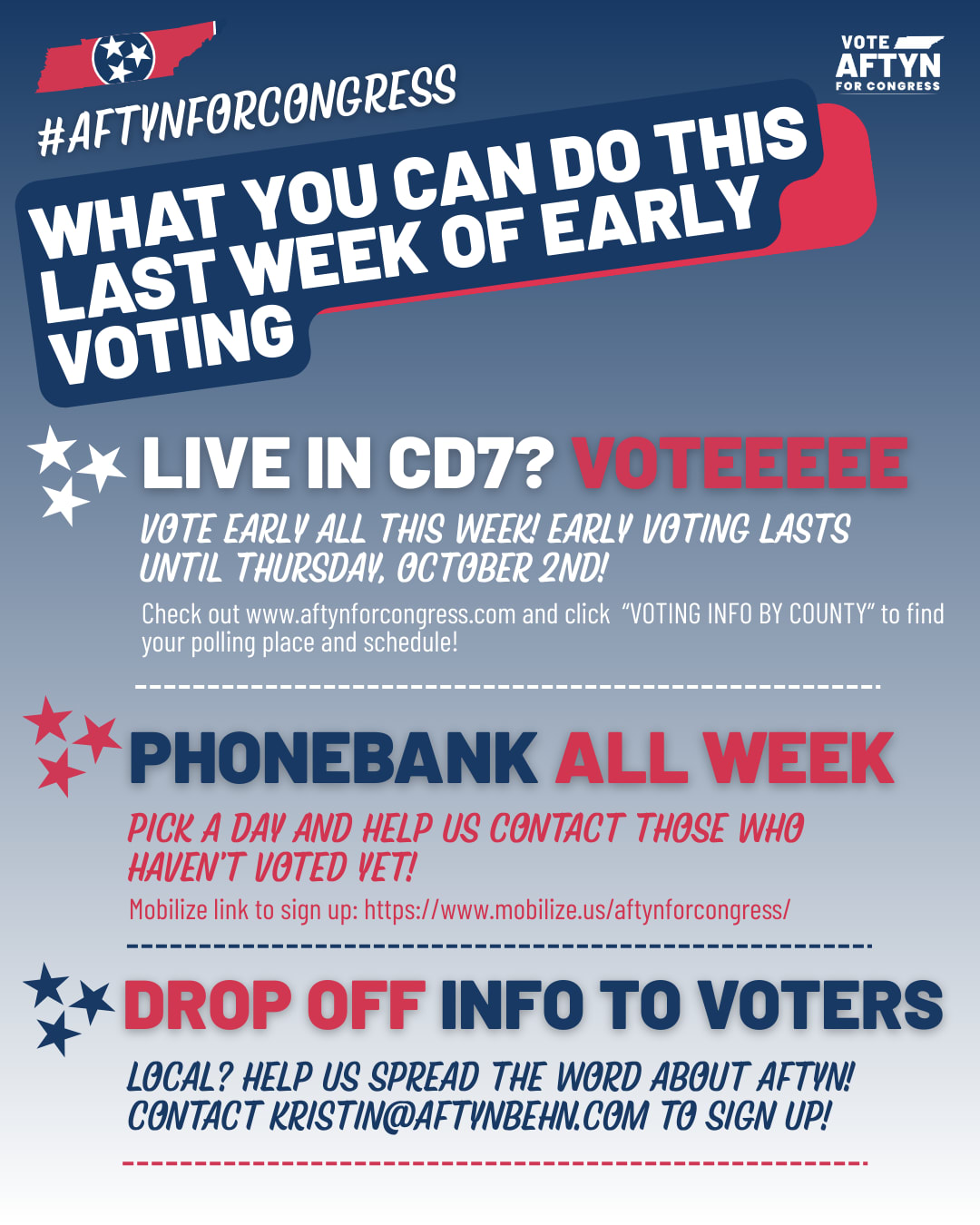 This race is a choice. As my sixth-grade favorite poet, Robert Frost, wrote, “Two roads diverged in a wood, and I—I took the one less traveled by, and that has made all the difference.” For me, the road less traveled is the path of people power. It’s slower, it’s harder, and it doesn’t come with multiple glossy mailers or campaign self-loans. However, it’s the only path that leads to trust, accountability, and a politics rooted in the lives of real people. October 7 is our fork in the road. Do we keep traveling the well-worn path of the Devil’s Bargain—where corporate money buys power and the rest of us are left with crumbs? Or do we take the road less traveled, the one built by us — social workers, teachers, nurses, veterans, and bus drivers who believe democracy still belongs to us? I believe we’re ready to choose differently. And if we do, it will make all the difference. Let’s go out and win this, Aftyn 8 DAYS OUT FROM THE ELECTION!!!!!!!!!!!!We’ve been hustling since Launch Day, and we’re so proud of all we’ve accomplished. An independent poll showed us with a slim margin in the Democratic Primary, but we always organize like we’re the underdog. Below is how you can help this final week to send Aftyn to Congress! VOLUNTEER TO PHONEBANKWe’ve got in-person and remote phonebanks almost every day this week! Join our incredible team of volunteers and staff to get out of the vote! WANT TO DROP OFF INFORMATION TO VOTERS?Live close to the district and want to get your steps in? Email our Field Director, Kristin, at [email protected] to grab some addresses and literature to drop off at houses that have yet to vote! ORGANIZE YOUR CONTACTSDo you know voters who live in CD7? Send them the link below, which contains voting information and times; instruct them to pull a Democratic ballot and vote for Aftyn! Running for Congress in TN D-07 to feed kids, fix roads, and fund hospitals. Fighting for working families and a future that works for all of us. #TN07 |