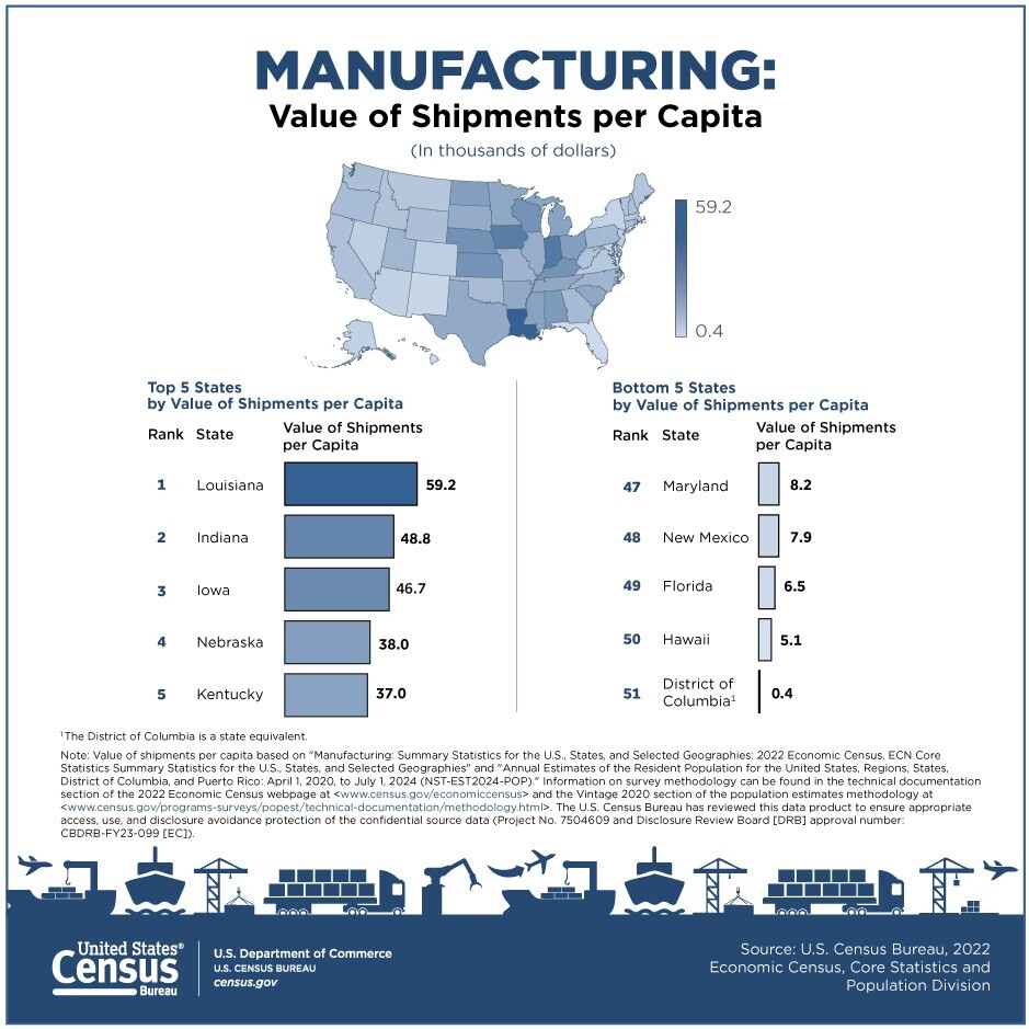 In 2022, for example, Louisiana ranked 25th by population but number one in value of manufacturing shipments (revenue) per capita while Florida — the nation’s third most populous state — was in the bottom five.