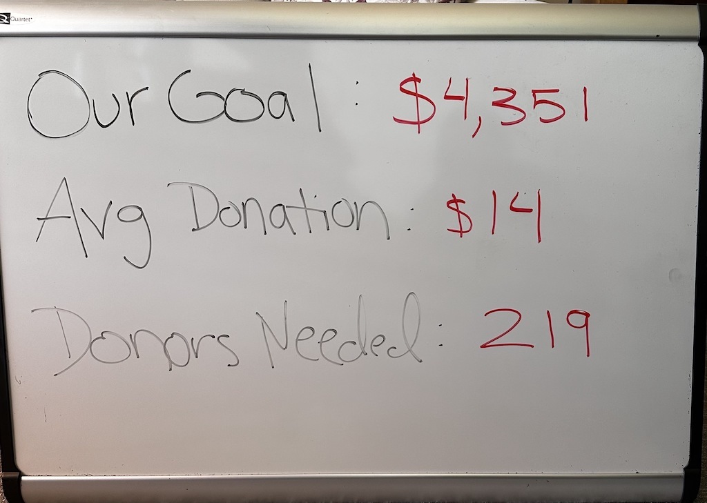 John, Our digital director has a giant whiteboard in her office. Every morning, we update it with our fundraising goals and where we stand in this fight. |