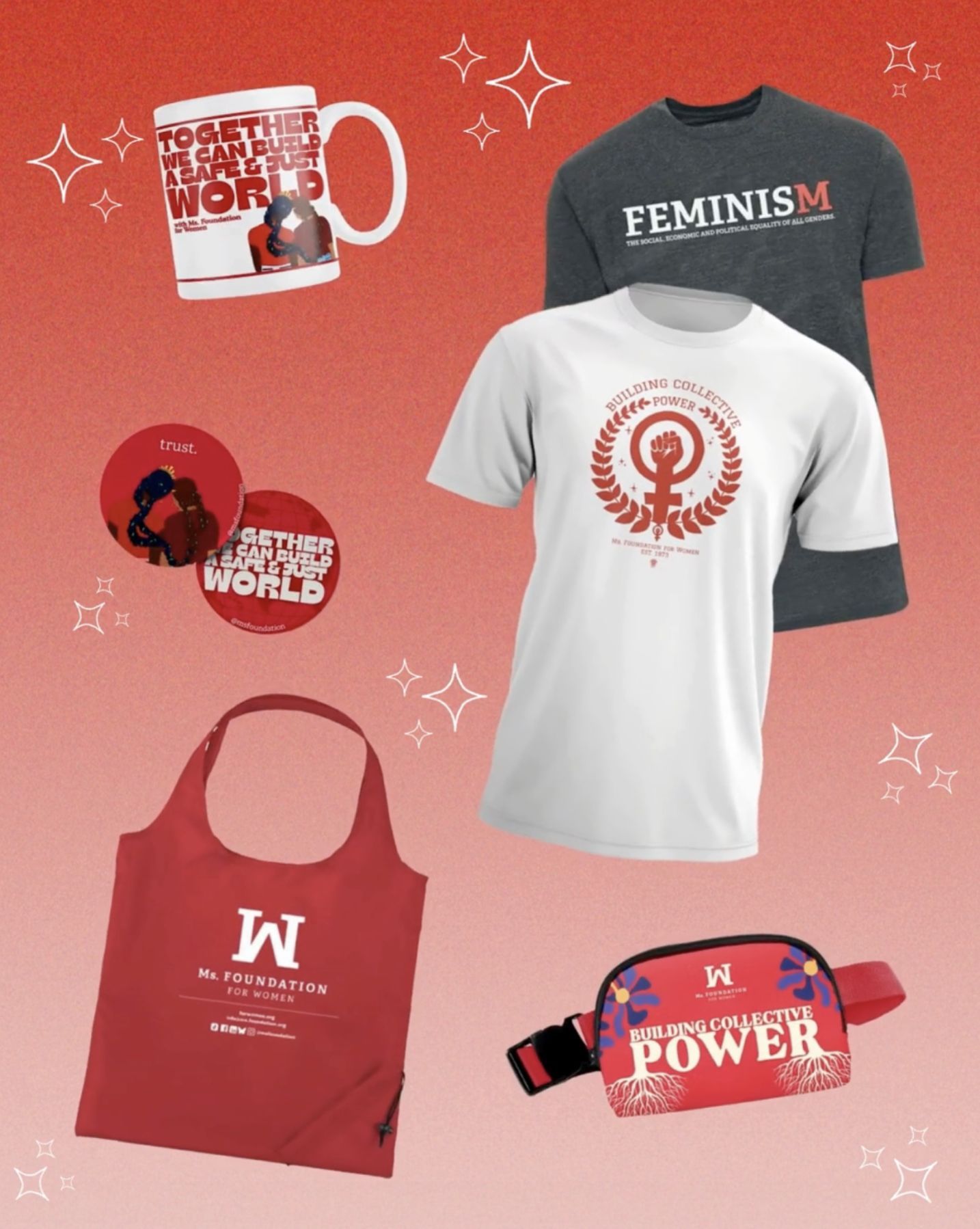 - "Feminism" Tee: This classic Ms. Foundation tee reads “feminism” in bold white lettering, with a standout red “M” that pays tribute to our logo.