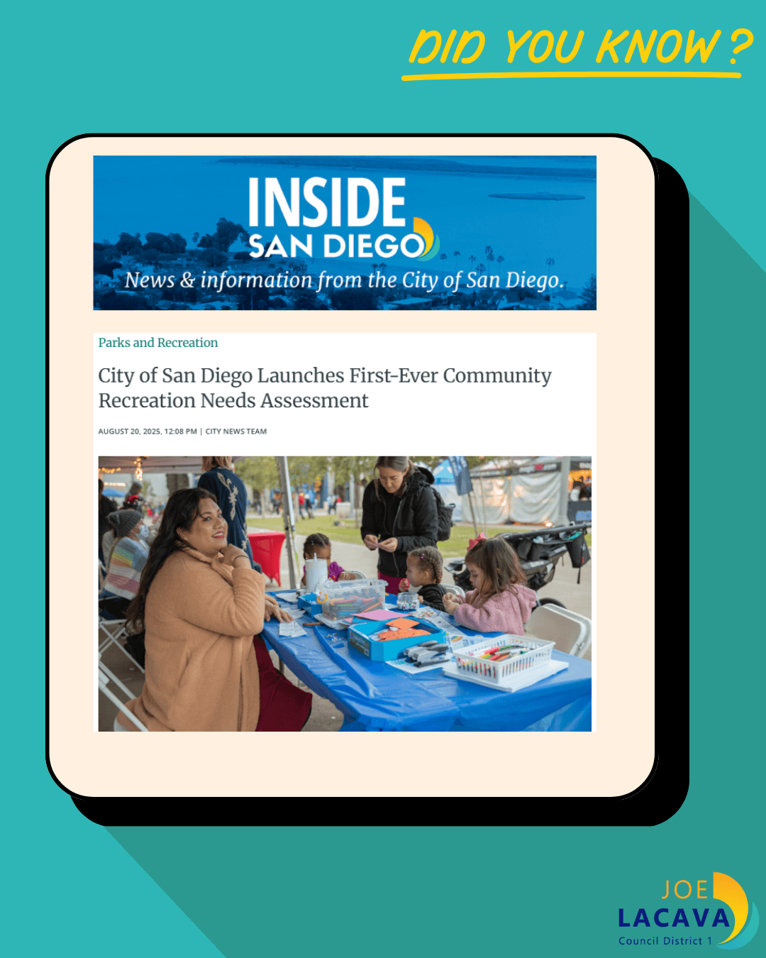 The City of San Diego launched its first-ever Community Recreation Needs Assessment to better understand how the Parks and Recreation Department can serve our communities. Share your thoughts in an online survey at sandiego.gov/parksurvey by February 28, 2026.