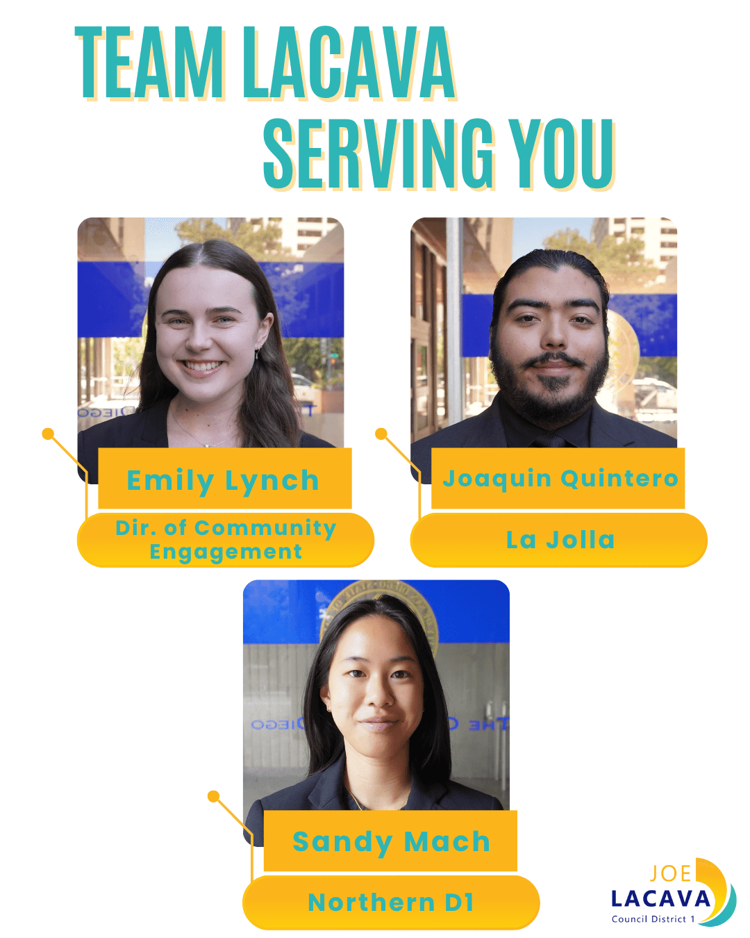 Please welcome Sandy Mach as Community Representative for Northern District 1. Sandy brings valuable community service experience working at City Council District 9 and SDSU. Joaquin Quintero now represents La Jolla, and Emily Lynch is our Director of Community Engagement.