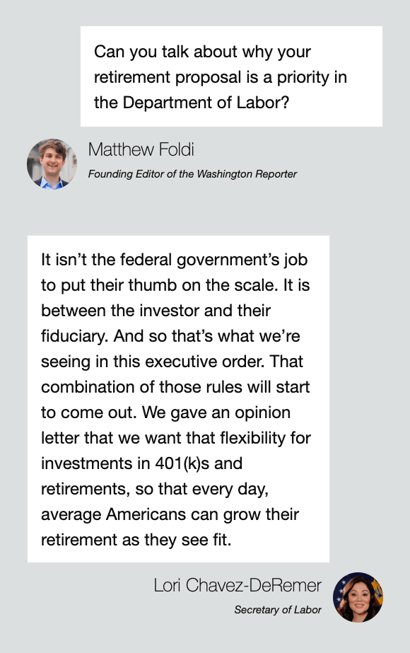 If you have a tip you would like to anonymously submit, please use our tip form — your anonymity is guaranteed! INTERVIEW: Labor Secretary Lori Chavez-DeRemer talks oyster farming and Americans’ retirement in Marylandby Matthew Foldi CAMBRIDGE, Md. — Secretary of Labor Lori Chavez-DeRemer visited the Horn Point Oyster Hatchery as part of her 50-state tour — and in an interview with the Washington Reporter, she explained why it’s important to directly visit American workers in the field and elaborated on her plans to help Americans expand what counts in their retirement accounts. Chavez-DeRemer, a former Mayor of Happy Valley, Oregon, explained why that experience is paying off in droves in her current role. “I say this all the time,” she told the Reporter: “as a former mayor, you really cannot understand what’s happening on the ground and how it affects the local economy, the every day, average worker, the American, unless you can talk to them.” “I wouldn’t know about this laboratory unless I’m here on site to hear these reports, to understand more about it,” she said. “The lovely woman who gave me the tour? She started off as an intern here. 29 years later, here she is talking about why the oyster industry is so important, and now her daughter is very interested.” INTERVIEW: The Small Business Committee brought creators to Congress. Here are their messages.by Matthew Foldi Rep. Roger Williams (R., Texas) and the Small Business Committee brought three creators to testify to Congress about “small businesses in the age of digital influence.” Following Williams’s hearing, in which the witnesses testified about the importance of everything ranging from LLC configuration to the tax code to tariffs and more, the three GOP witnesses spoke with the Washington Reporter about their message to Congress and to the nation. Williams, for his part, told the Reporter that “the creator economy represents the new generation of American entrepreneurship — building companies, supporting jobs, and driving innovation across every industry.” “But digital small business owners face unique challenges,” Williams continued, “from unpredictable revenue streams to costly intellectual property protections. To keep America competitive, we must ensure creators have the freedom and opportunity to thrive in the digital economy.” Heard on the Hill