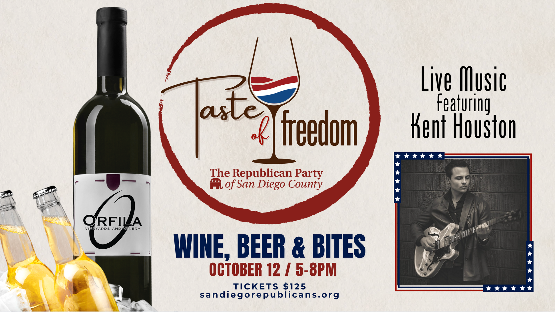 The Republican Party of San Diego County invites you to our upcoming “Taste of Freedom” event on Sunday, October 12, from 5:00–8:00 PM at Orfila Vineyards and Winery in Escondido.
