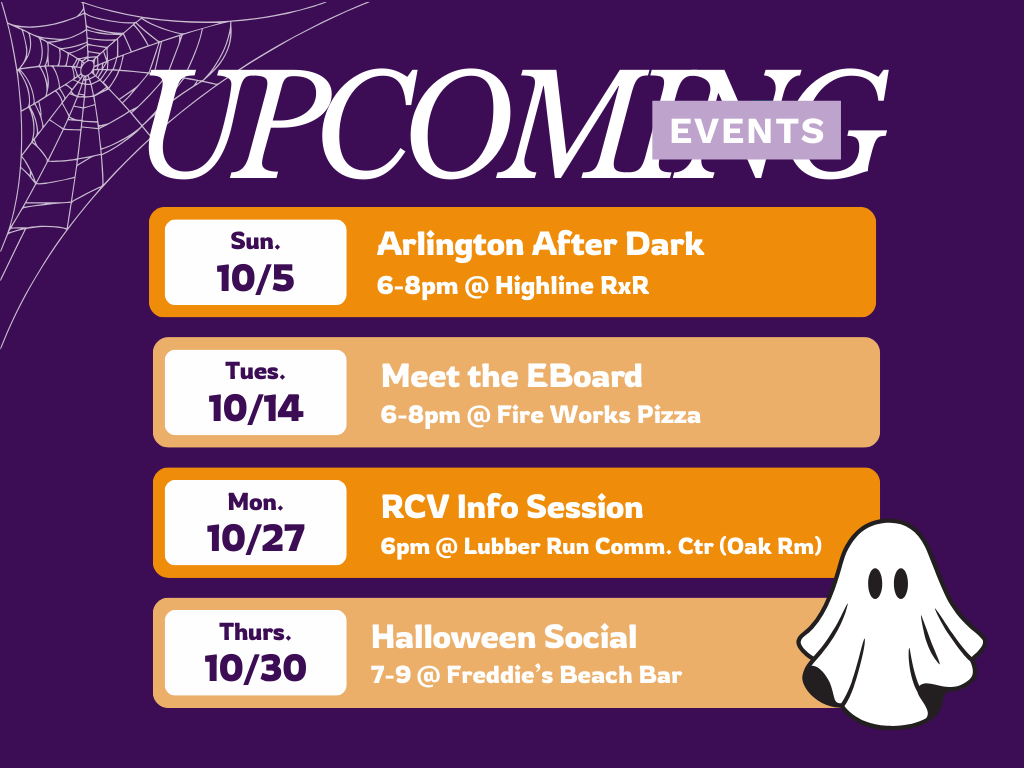 October is here, and AYD is diving into a busy month! From spooky Halloween fun to crucial get-out-the-vote efforts ahead of the November election, there’s no shortage of ways to get involved. We’ve also just launched our revamped website—arlingtonyoungdems.org—where you can explore our upcoming events, volunteer opportunities, information about our upcoming e-board election, and more! Be sure to check it out and stay plugged in this fall!