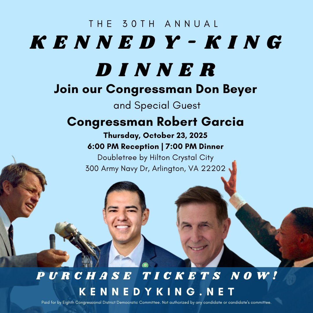 Join us for the 30th Annual Kennedy-King Dinner featuring special guests Congressman Don Beyer and Congressman Robert Garcia (CA-42). Enjoy a reception and dinner with recognition for donors, sponsors, and scholarship recipients. 👉 Purchase your tickets here.