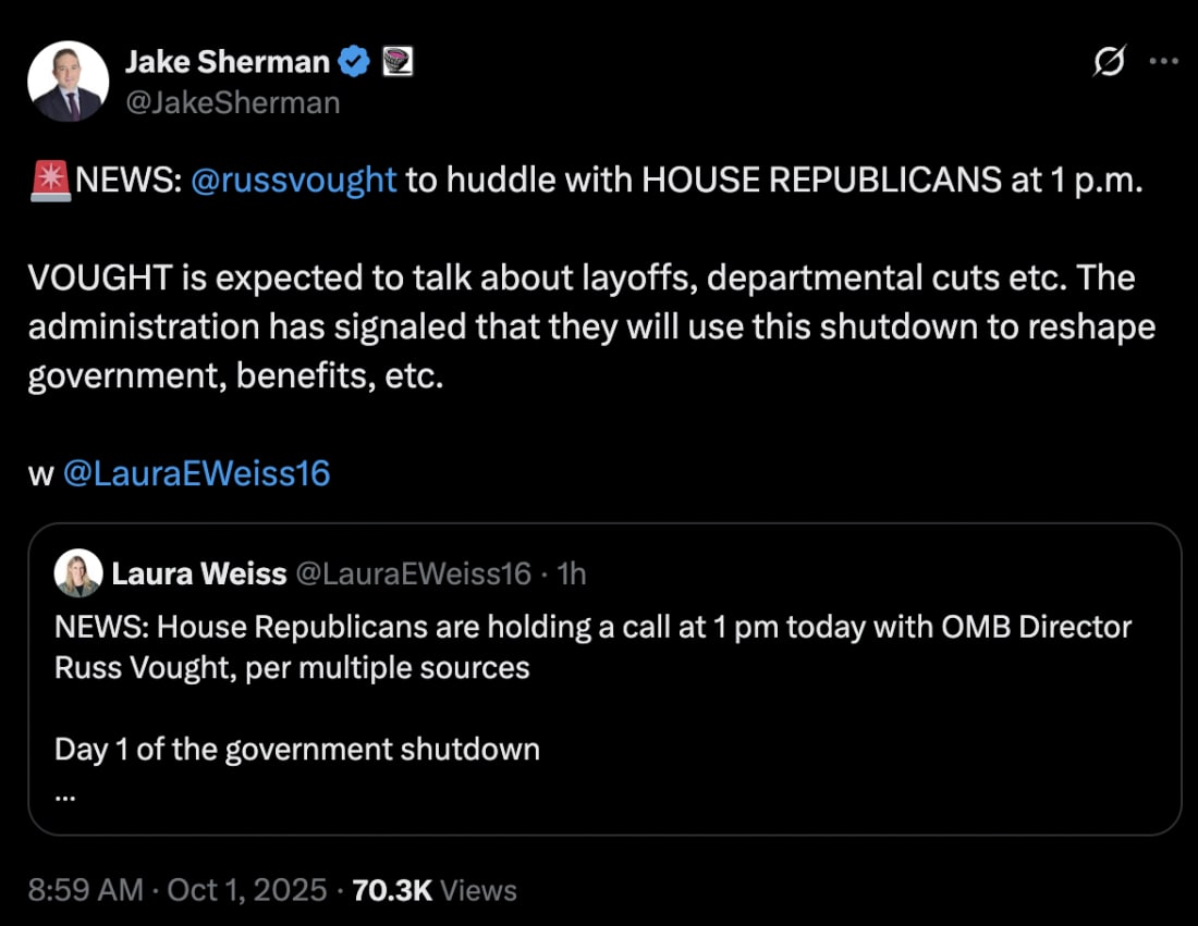 Mass Furloughs Grip Agencies: Up to 750,000 workers face daily furloughs with Trump and OMB Chair rumored to be planning to use the shut down to accelerate cuts to government agencies.