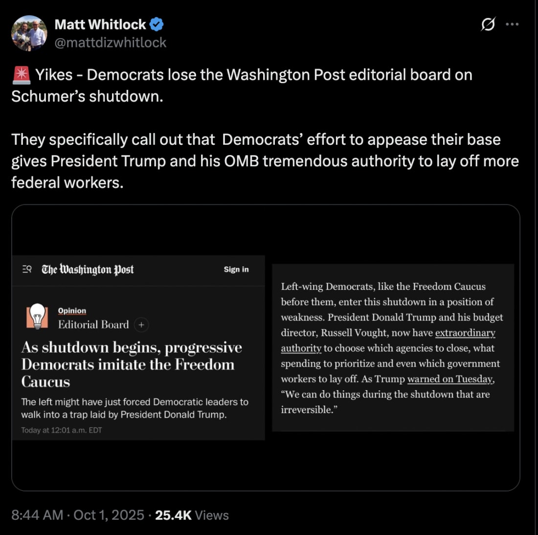 As the government shutdown grips the nation, a New York Times/Siena College poll reveals 65% of registered voters urged Democrats not to force a federal closure over their unmet demands. The Democrat strategy even got called out by the Washington Post Editorial Board