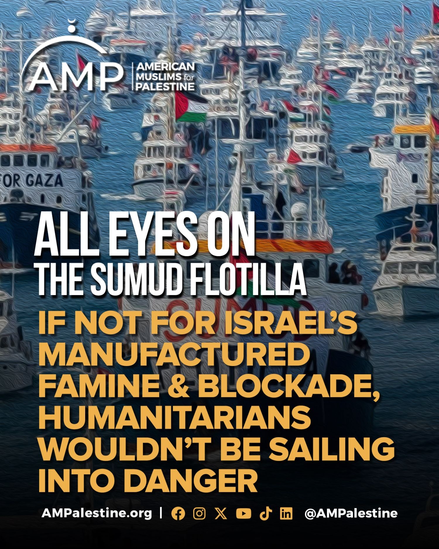 If not for Israel’s manufactured famine and blockade, humanitarians wouldn’t be sailing into danger Dear Email, Israeli warships are approaching the Global Sumud flotilla as it attempts to deliver desperately needed food, water, and medicine to Gaza. Governments, including the U.S., must act now to prevent another violent interception and to protect the lives of humanitarian volunteers aboard. This flotilla is a multinational humanitarian effort; people from dozens of countries, including the U.S., are on board exercising their right to deliver lifesaving aid to a population under an internationally condemned blockade. Palestinians are being deliberately starved through a man-made famine engineered by Israel’s ongoing siege. Entire families are barely surviving on animal feed, weeds, and contaminated water, while children waste away from preventable hunger and dehydration. Any attempt to stop or seize these ships is not just an attack on the activists volunteering, but an extension of the same policy of collective punishment that is strangling Gaza. Intercepting the flotilla will risk civilian lives and obstruct desperately needed food and medicine. Israel has a long record of intercepting Gaza-bound aid ships, most infamously on May 31, 2010, when Israeli commandos raided the Mavi Marmara, killing nine civilians, including 19-year-old American citizen Furkan Doğan, who was shot five times while filming with his camera, and fatally injuring a tenth, who later died. Dozens more were wounded, many by live fire at close range. We call on all governments with nationals on the flotilla to publicly demand safe passage and position naval or diplomatic assets to protect their citizens. The starvation blockade is illegal, and these volunteers have every right to try to deliver lifesaving supplies to Gazans suffering under Israel’s siege. The international community must act now to end Israel’s maritime piracy and to ensure that humanitarian law and human life are protected. ALL EYES ON THE SUMUD FLOTILLA. PROTECT HUMANITARIANS. DEFEND HUMAN LIFE. In Solidarity, American Muslims for Palestine (AMP) |