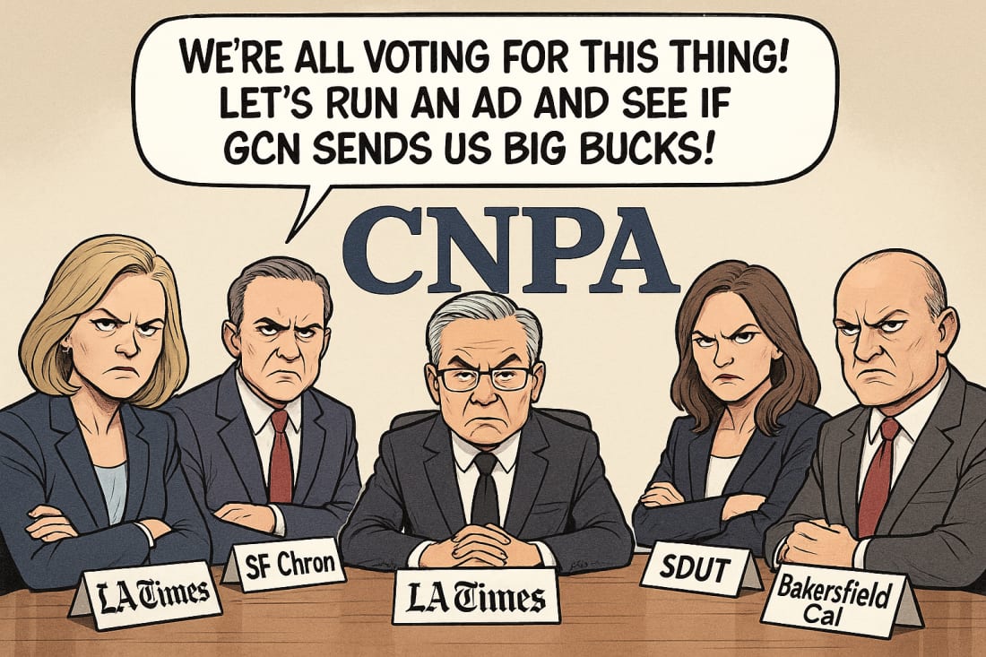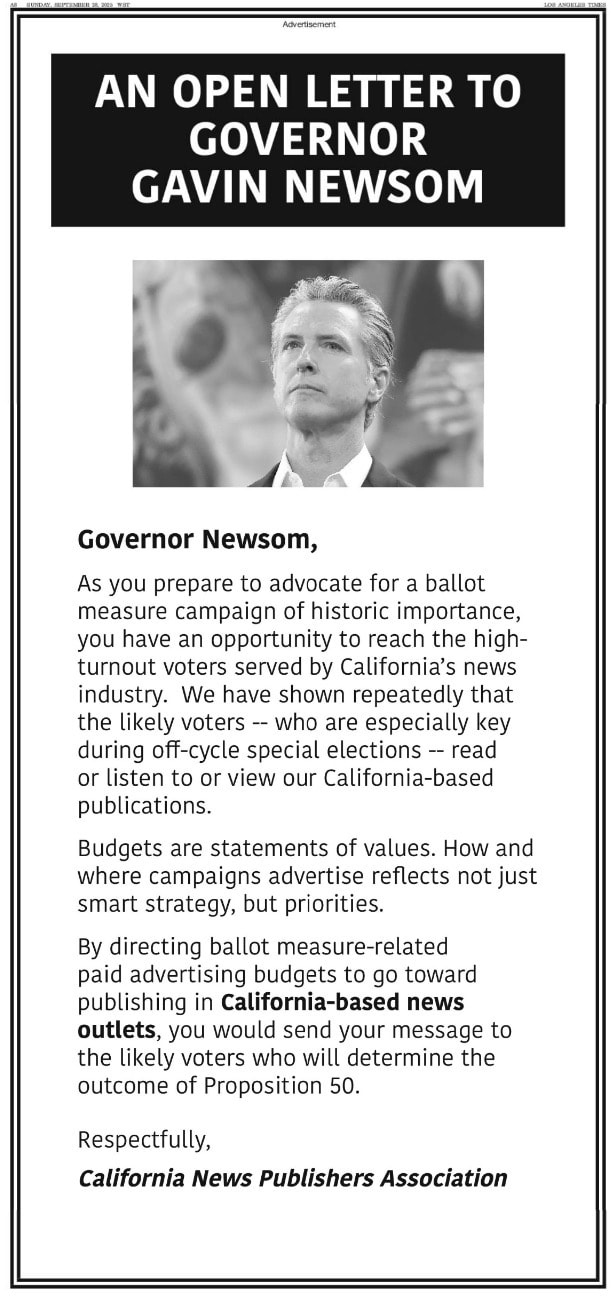 ⏱️ 6–7 min read Usually our afternoon columns are for our paid subscribers, but this one is for everyone’s consumption. But there is bonus content below for our premium subscribers. A Public Plea in the Los Angeles Times Last Sunday, readers flipping through the Los Angeles Times may have noticed something unusual: a full-page ad, not from a company or political committee, but from the California News Publishers Association (CNPA), the trade association representing hundreds of California newspapers and outlets. The ad wasn’t subtle. Under the headline “An Open Letter to Governor Gavin Newsom,” the CNPA urged the governor to pour ballot measure advertising dollars into their pages. The letter touted newspaper readers as “high-turnout voters who will determine the outcome of Proposition 50” and asked Newsom to place ballot-measure ads in California-based outlets. That’s not journalism. That’s lobbying for cash. Public reporting highlights a Newsom-directed appeal; I have not seen public ads comparable to those of Kevin McCarthy or Charles Munger, Jr. in the Los Angeles Times. And when you consider that the paper itself sits on CNPA’s board, you can’t help but wonder: did they even pay for the space? A Public Campaign, Not a Private AskInterestingly, CNPA made an affirmative decision to wage this campaign publicly, not behind closed doors. Usually, publishers seeking campaign advertising would quietly appeal to media buyers. Instead, the association chose to run a full-page ad thousands of Californians would read — effectively handing Governor Newsom a political gift. To the extent Newsom’s strategy is not just to pass Prop 50 but to use it as a platform for his national ambitions, he benefits from this kind of publicity. The ad tied him publicly to the campaign, while newspapers positioned themselves as eager partners. Does anyone doubt the publisher of a major California newspaper could reach media-obsessed Newsom directly? This wasn’t about access. It was about shaping a narrative — giving Newsom free campaign coverage while angling for paid ads. A Watchdog Calls It OutJoel Fox, the longtime president of the Howard Jarvis Taxpayers Association, now writes on his California & Beyond Substack, which he flagged the CNPA’s appeal as another troubling example of how the state’s media establishment chooses sides rather than reporting fairly. Here’s how Fox put it: