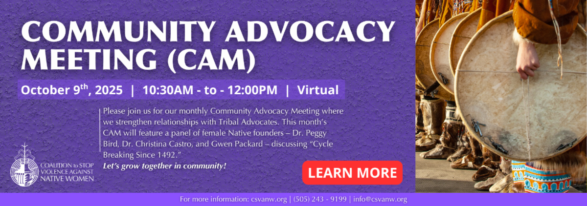 The Coalition to Stop Violence Against Native Women (CSVANW) invites you to our upcoming Community Advocacy Meeting (CAM), a dedicated space to build relationships, share resources, and strengthen our collective efforts to support Tribal communities.