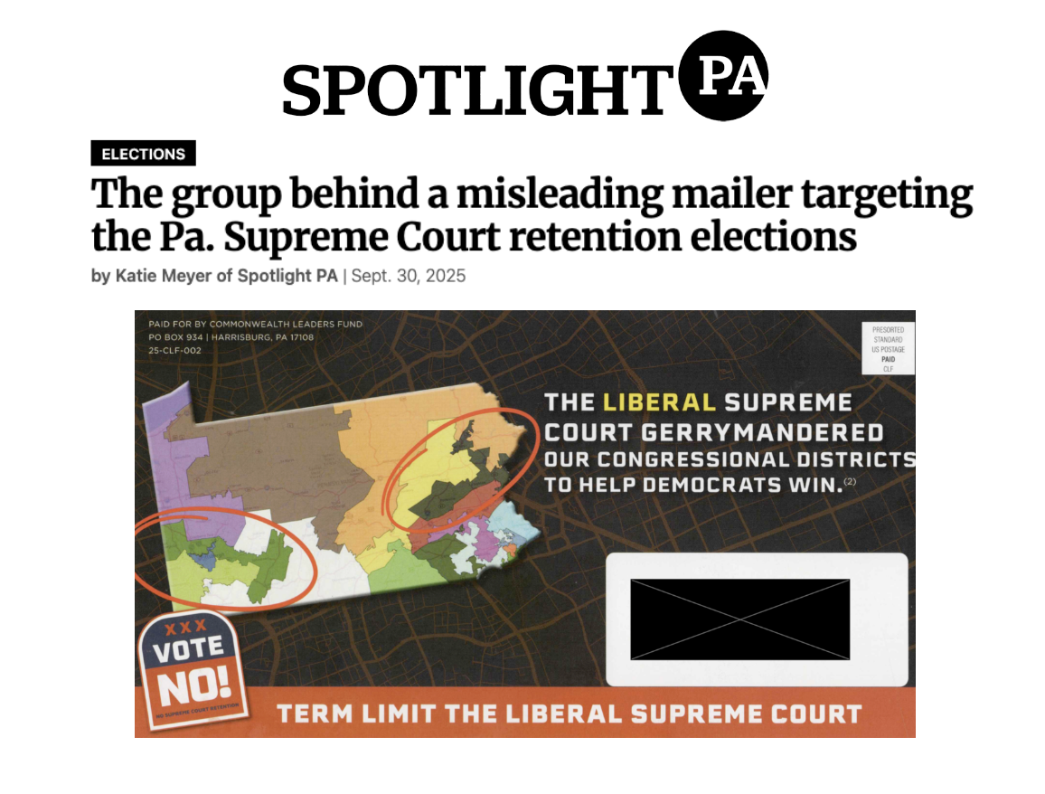 This mailer from a PAC bankrolled by the richest man in PA, ultra-maga billionaire Jeff Yass, says that the “liberal Supreme Court gerrymandered our congressional districts to help Democrats win” and includes an image of a congressional map, with two mangled districts circled in red.
