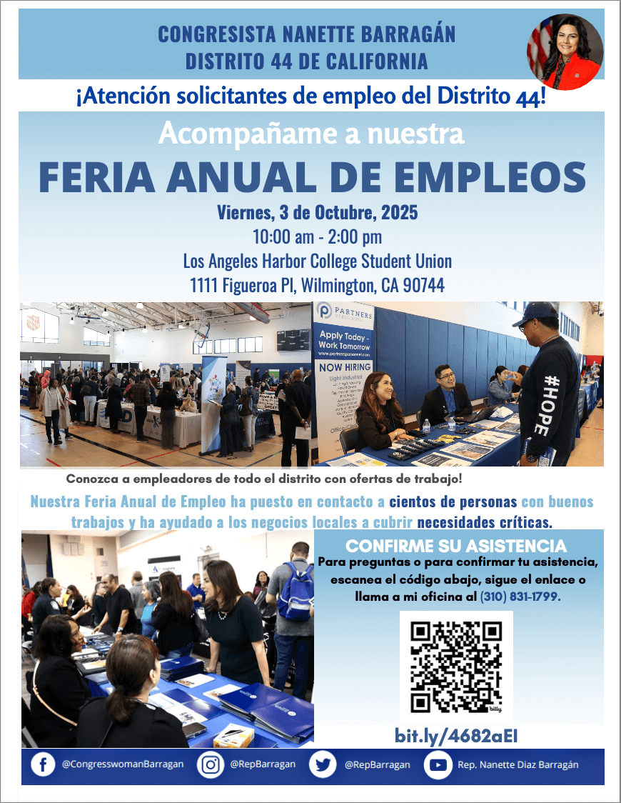 ¡Mi Feria Anual de Empleo este viernes, 3 de octubre de 10:00 am a 2:00 pm, en Los Angeles Harbor College, Student Union en 1111 Figueroa Place en Wilmington!