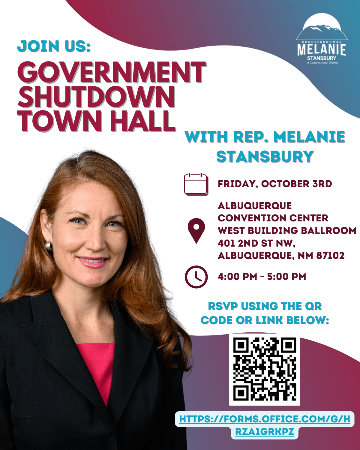 I’ll be home tomorrow, Friday, October 3rd, at 4:00 pm, for a Community Town Hall to talk about the government shutdown. I'll be covering what is happening and answering any questions you have. RSVP here. | It is an honor to represent you in Congress. As always, if I can assist you or your family, please do not hesitate to reach out to our District Office at (505) 346–6781! If you’d like to keep up to date on what I am working on in Washington, D.C., you can subscribe to our newsletter here and follow me on Facebook, Instagram, X, Threads, Bluesky, YouTube, Substack, and TikTok. | Rep. Melanie Stansbury Member of Congress | Sign up for my newsletter to get updates on this issue and others! | Washington, D.C. Office 1421 Longworth House Office Building (202) 225-6316 | Albuquerque Office 6301 Indian School Rd NE Suite 420 Albuquerque, NM 87110 (505) 346-6781 | |