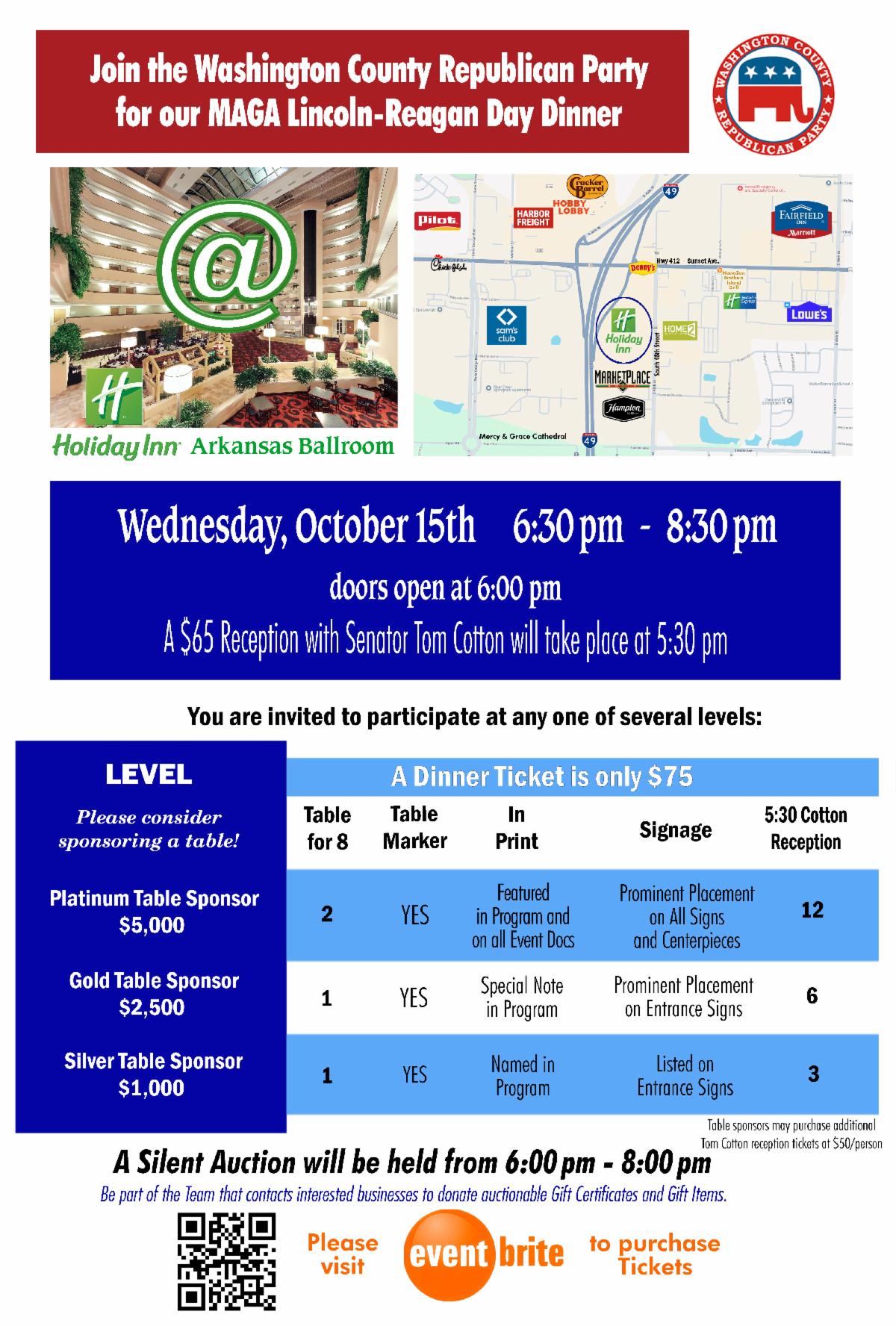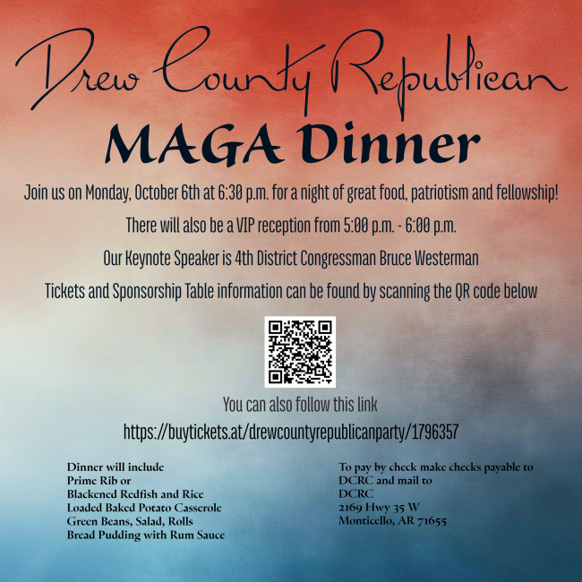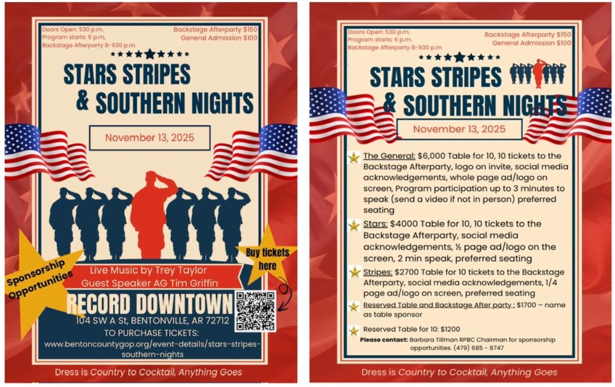 | | Monroe County Republican Committee Lincoln Fall Dinner with Attorney General Tim Griffin | | Drew County Republican MAGA Dinner with Congressman Bruce Westerman | | Perry County Republican Committee Candidate Country Supper with State Senator Terry Rice and State Representative Mary Bentley | | Arkansas Federation of Republican Women Convention | | Washington County Republican Party MAGA Lincoln-Reagan Day Dinner | | Lawrence County Republican Committee Trump Day Dinner | | Garland County Republicans Lincoln-Reagan Dinner with Missouri Congressman Jason Smith | | Jefferson County Republican Committee Top of the Ticket Dinner with U.S. Senator Tom Cotton and Congressman Bruce Westerman | | Benton County Republicans Star Stripes and Southern Nights Dinner with Attorney General Tim Griffin | | | | |