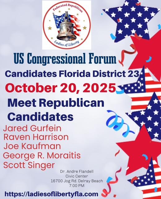 | | Note: The Republican Party of Palm Beach County posts notices from all Republican candidates as requested. The Republican Party of Palm Beach County provides these notices for information purposes only and does not take sides or make endorsements in primary elections. | | CFC LEGISLATIVE VICTORY BREAKFAST, OCT. 11 | |