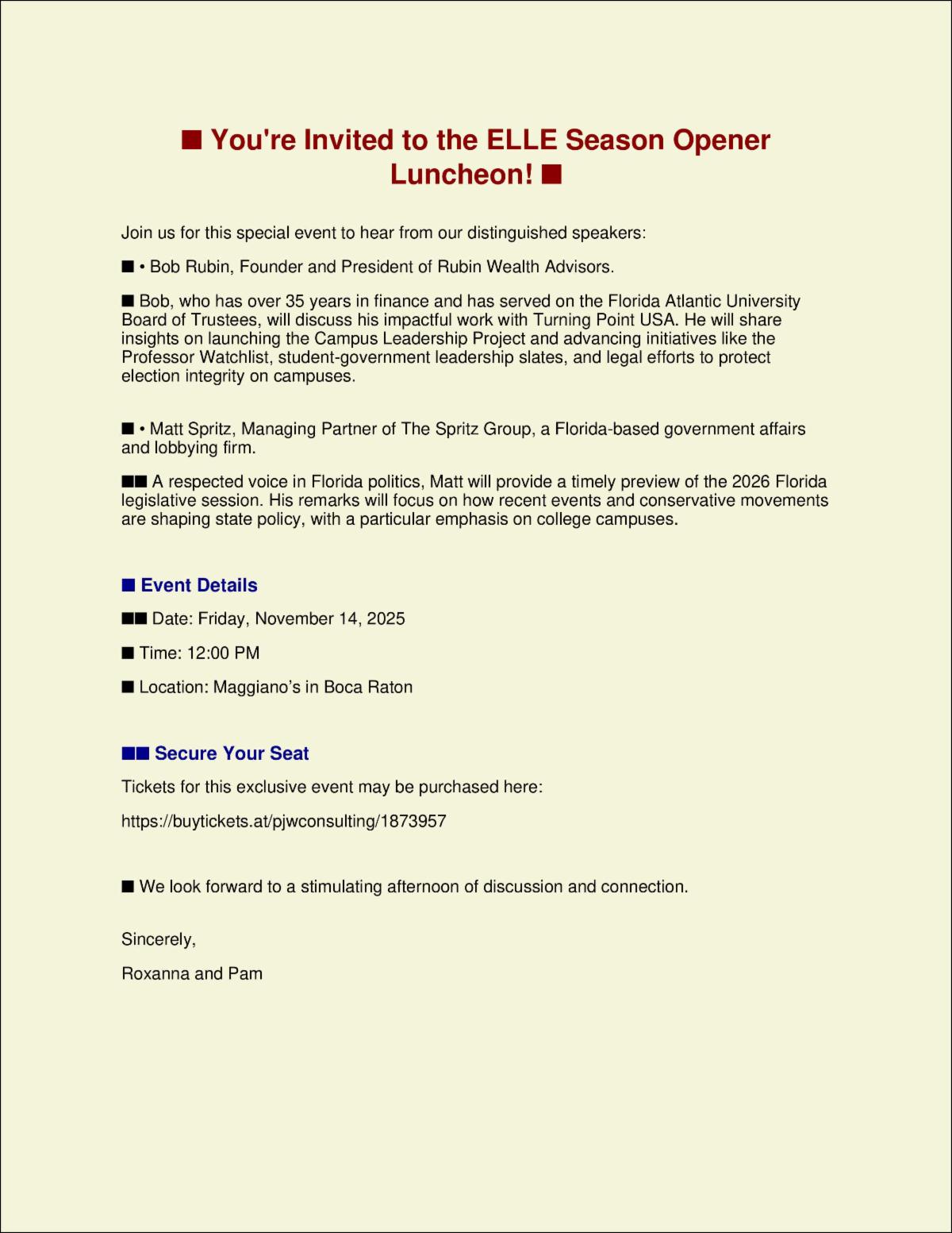 We will be honoring the life of TPUSA CEO Charlie Kirk with TPUSA Faith Regional Manager Seth Tweeddale. You will also hear directly from newly appointed County Clerk Mike Caruso, State Rep. Anne Gerwig, and former State Rep. Rick Roth, along with emcees Gina and Bo Loudon, and learn what CFC Florida was able to accomplish this year in Tallahassee and beyond.