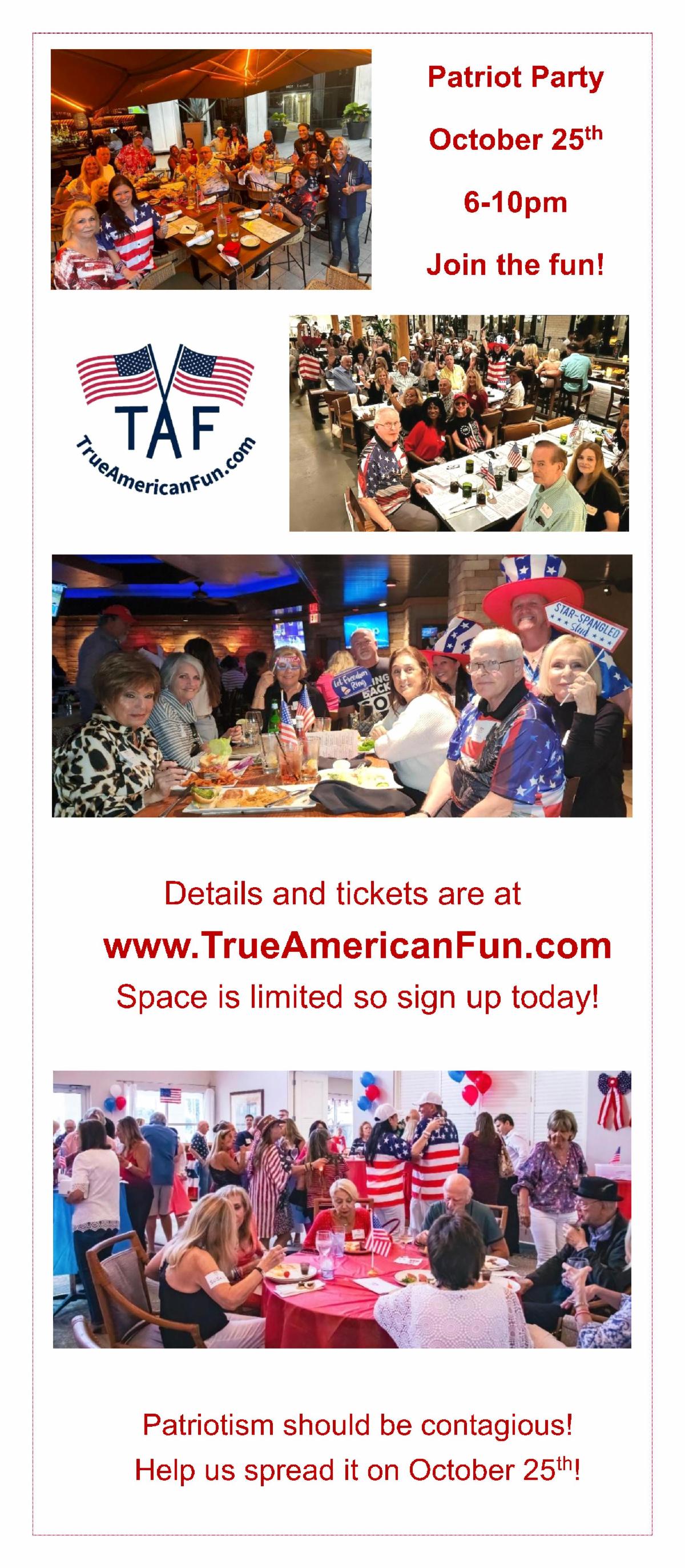 Eat, drink, meet, mingle, dance and have fun with fellow proud Americans on Saturday October 25th. For details visit www.TrueAmericanFun.com. Space is limited, so sign up today!