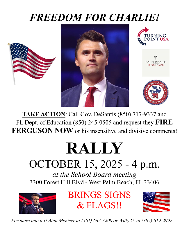 "The Wire" is a weekly e-bulletin of the Palm Beach County Republican Party. If you would like to submit an entry for it, please send your submission to [email protected] by 5:00 pm on Tuesday. The Wire goes out every Thursday, and includes announcements of upcoming club events, candidate announcements, notices from the Republican Party of Palm Beach County, and items of interest from related organizations.