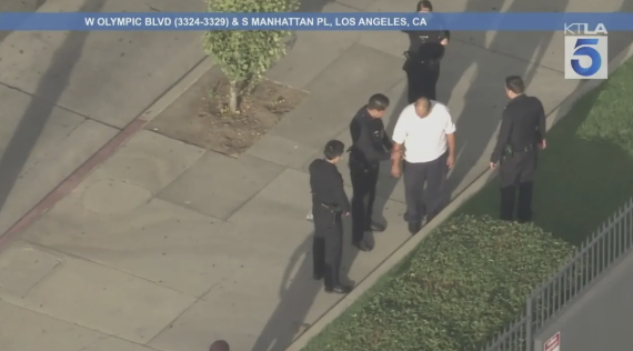 Officers with the Los Angeles Police Department were in pursuit of a motorcyclist reportedly wanted for assault with a deadly weapon on a peace officer. The suspect led officers in chase on several L.A. freeways before exiting to surface streets and winding his way back to the 10 Freeway. Later, on Western Avenue, the rider was splitting lanes, coming dangerously close to other motorists, before driving into a parking garage near Olympic, which was quickly surrounded by police. Aerial footage from Sky5 captured police briefly taking a man into custody and then releasing him. However, moments later, as the man was walking away, police stopped him again and took him into custody.