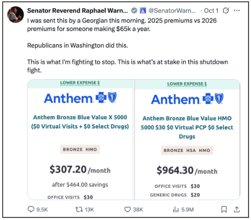 Democrats, including Senator Raphael Warnock (GA), are sharing examples of skyrocketing premiums from constituents to increase pressure on Republicans to negotiate.