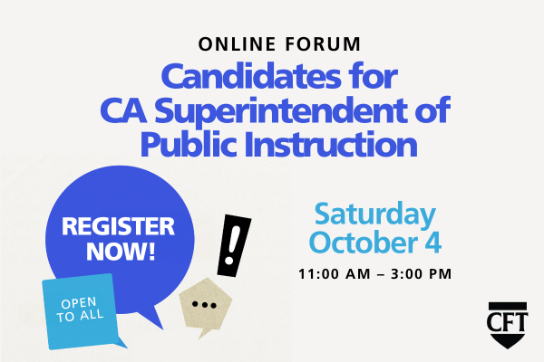 All are welcome to attend our online forum for candidates for State Superintendent of Public Instruction (SPI), set for this Saturday from 11:00 a.m.–3:00 p.m. Hear from six SPI candidates about their campaigns and priorities for public education in California. The SPI is a critical position, elected by voters to lead the California Department of Education (CDE), helping to implement state TK-12 education policy and provide direction to local school districts.