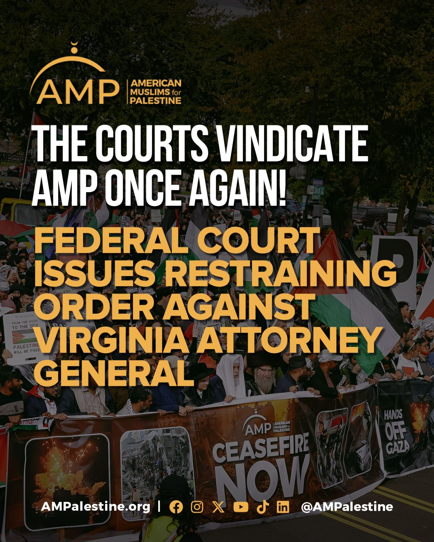 Federal Court Issues Restraining Order Against Virginia Attorney General Dear Email, In a major legal victory today, AMP's legal team, led by MLFA's Christina Jump and Samira Elhosary, convinced the judge in federal court to prevent the Attorney General's prying into AMP records. The Attorney General sought to compel AMP to give up vital records while AMP continues to exercise its rights on appeal. The judge ruled that no records could be requested while AMP was in the process of appealing. This is the third major legal victory for AMP in a span of a couple of months, and it is a clear indication that when the law prevails over politics, AMP will always prevail. We pray these victorious outcomes continue, and we thank our incredible legal team for their outstanding work fighting the Israel lobby and corrupt government officials. As Gaza continues to bleed and the Palestinian people face annihilation, we make our pledge to continue this fight on their behalf and on behalf of our entire community, inshallah. |