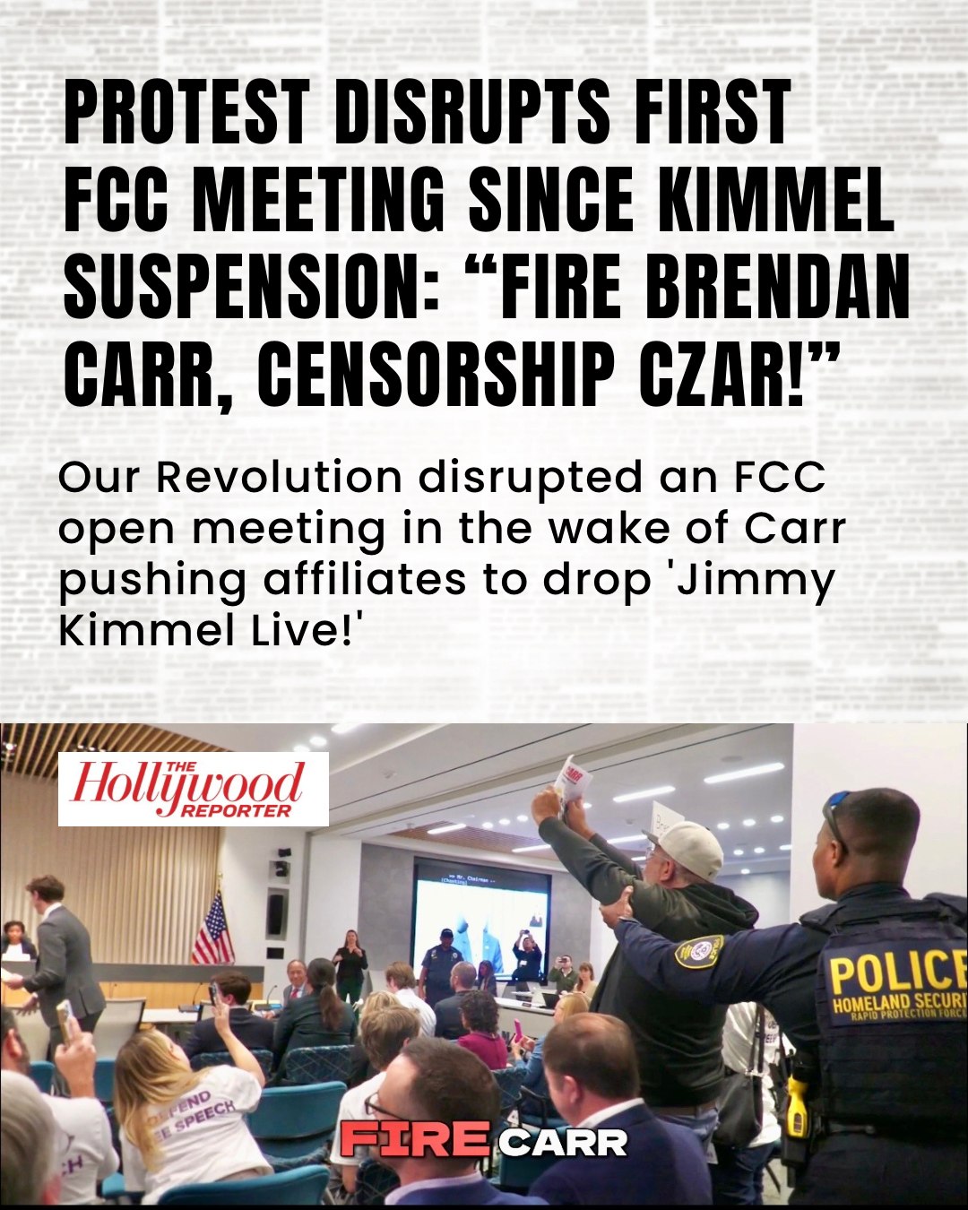 On Tuesday, Our Revolution activists confronted Trump’s censorship czar at the FCC’s first open meeting since he pressured ABC affiliates to pull Jimmy Kimmel Live! off the air.