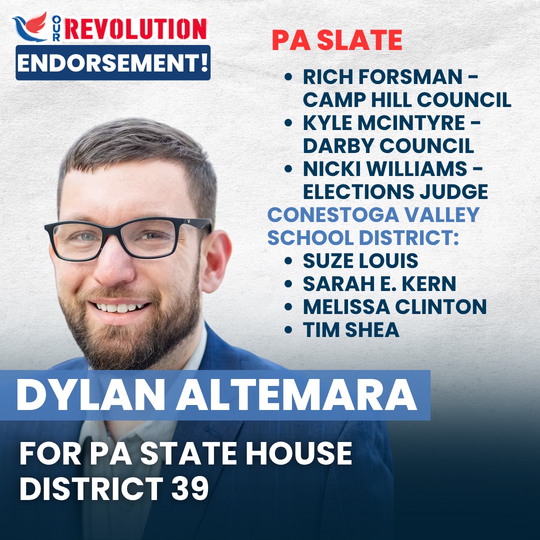 We have a great line up of candidates in Pennsylvania. Our Revolution is proud to support Dylan Altemara for PA State House District 39, Rich Forsman for Camp Hill Borough Council, Kyle McIntyre for Upper Darby Township Council, and Nicki Williams for Judge of Elections in District 2-1. We’re also endorsing four progressives for Conestoga Valley School District: Suze Louis, Sarah E. Kern, Melissa Clinton, and Tim Shea.