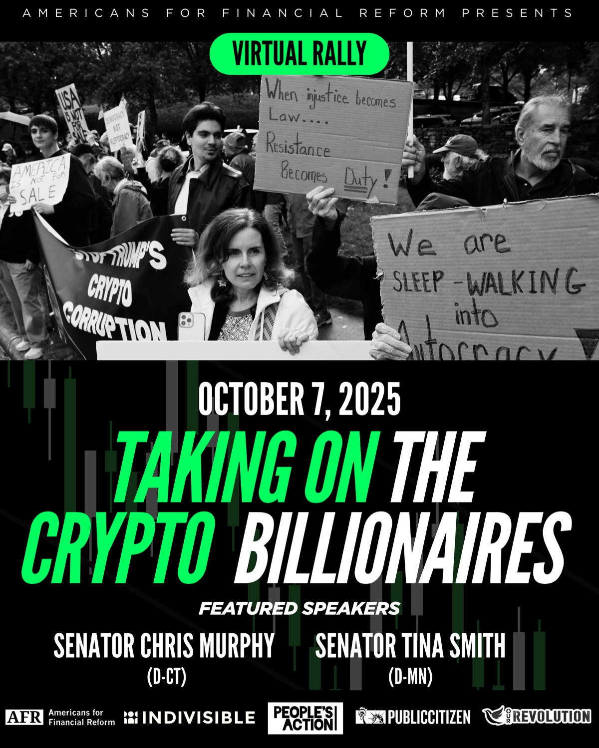 Join our LIVE virtual rally with Sens. Chris Murphy (D-CT) and Tina Smith (D-MN) on Tuesday, Oct. 7 in coalition with Indivisible, Americans for Financial Reform, and People’s Action.
