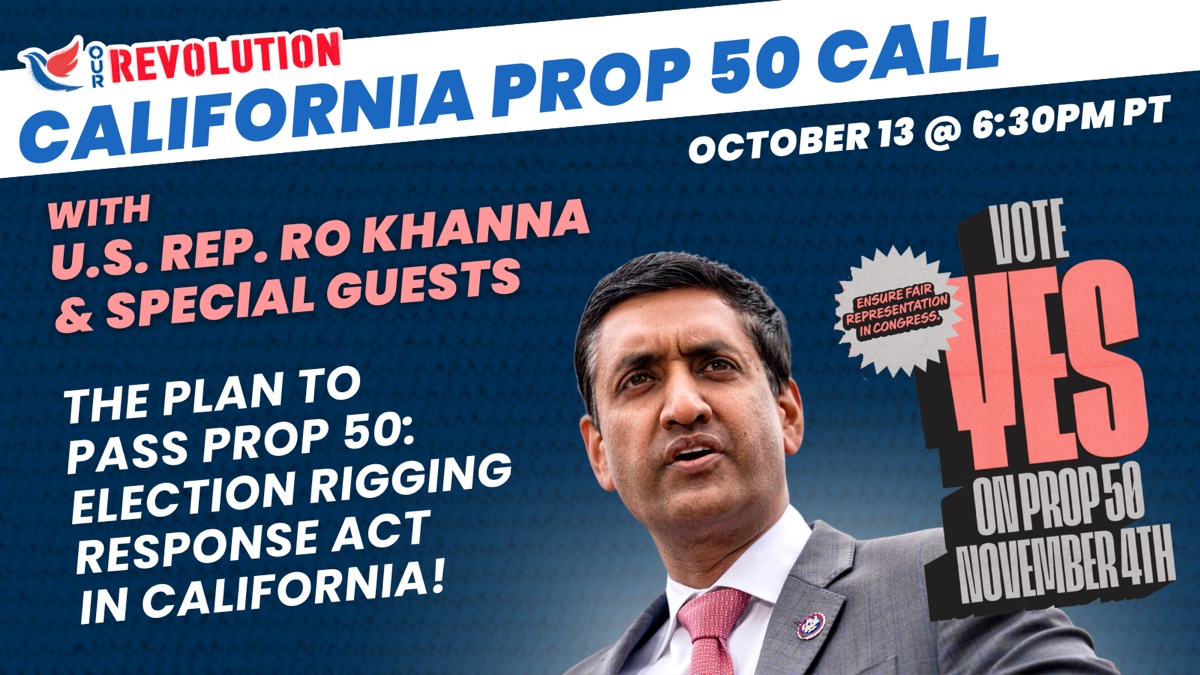 Tune-in October 13th for a Live California Call with U.S. Rep Ro Khanna and special guests as we organize to pass Prop 50 — the Election Rigging Response Act. This is how we fight back against Trump and the GOP’s dirty redistricting scheme! RSVP HERE. |