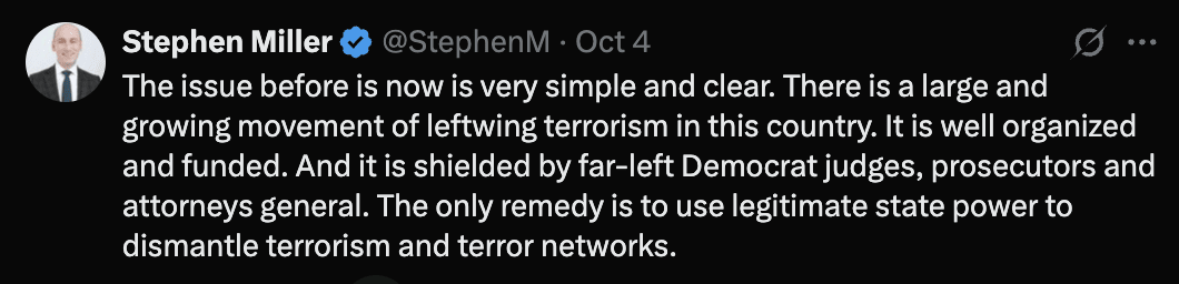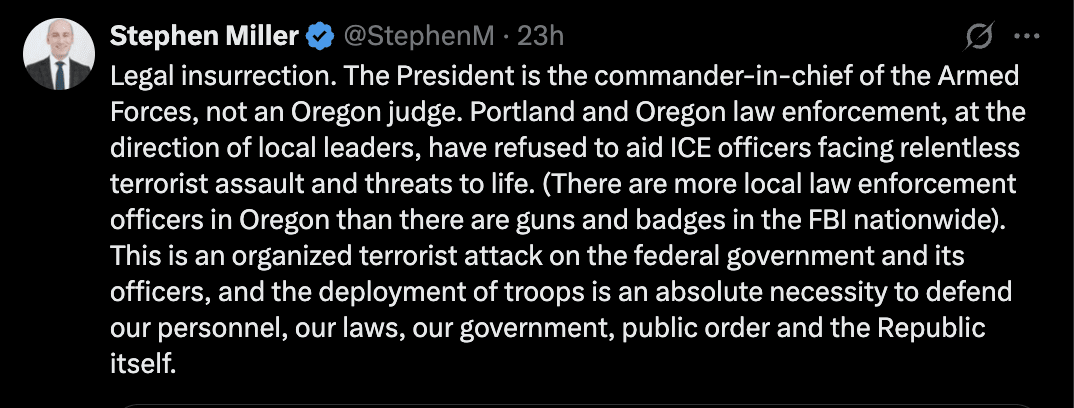A federal judge on Saturday prohibited Donald Trump from deploying Oregon National Guard troops into Portland on the basis of a fabricated emergency, just as a federal judge in California held a few weeks earlier that his deployment of troops into the streets of Los Angeles violated the Posse Comitatus Act. “This country has a longstanding and foundational tradition of resistance to government overreach, especially in the form of military intrusion into civil affairs,” wrote Karin Immergut. “This historical tradition boils down to a simple proposition: this is a nation of constitutional law, not martial law.” There are two notable differences between the cases: The first is that Immergut is one of Trump’s own appointees. The second is that Trump blew past her order contemptuously. If he couldn’t deploy Oregon’s own national guard against the residents of Oregon, he’d federalize National Guard forces in other states and deploy them into Oregon and other blue states. We can only surmise that this workaround was the brainchild of Trump’s mentally ill senior adviser Stephen Miller, who chooses to communicate like a Reichsminister. Immergut quickly intervened to broaden the terms of her restraining order. But she’s just one judge, and the administration seems hell bent on establishing martial law in some jurisdiction on the basis of lies and fantasies. One of the targets of these lies is Trump himself. The executive-branch’s normal chain of command has broken down, and Miller derives power by propagandizing his own boss, who then delegates him authority to retaliate. Trump reportedly intimated to Oregon’s governor that he’d been manipulated into besieging Portland by watching old B-roll footage of street unrest on Fox News. He seems to have been duped by an A.I.-generated video depicting himself promoting “medbeds,” which are like hyperbaric oxygen chambers that cure all ailments—except unlike hyperbaric oxygen chambers, medbeds don’t actually exist. And, perhaps under Miller’s sway, Trump seems to believe the politics of the ongoing government shutdown favor him. Both men continue to insist, in their own noxious ways, that Democrats provide votes to fund this madness. IN SICKNESS AND HEALTH CAREIt is heartening, on the whole, that Democrats are winning the battle for public opinion over who’s to blame for the government shutdown. Democrats aren’t primed to scrap the way Republicans are, and need positive reinforcement from the public in order to maintain a fighting posture for more than a few days. It’s frustrating, though, that many of them will misread the polling to vindicate their decision to choose expiring health-care subsidies as the basis of this confrontation. ... Subscribe to Off Message to unlock the rest.Become a paying subscriber of Off Message to get access to this post and other subscriber-only content. A subscription gets you:
